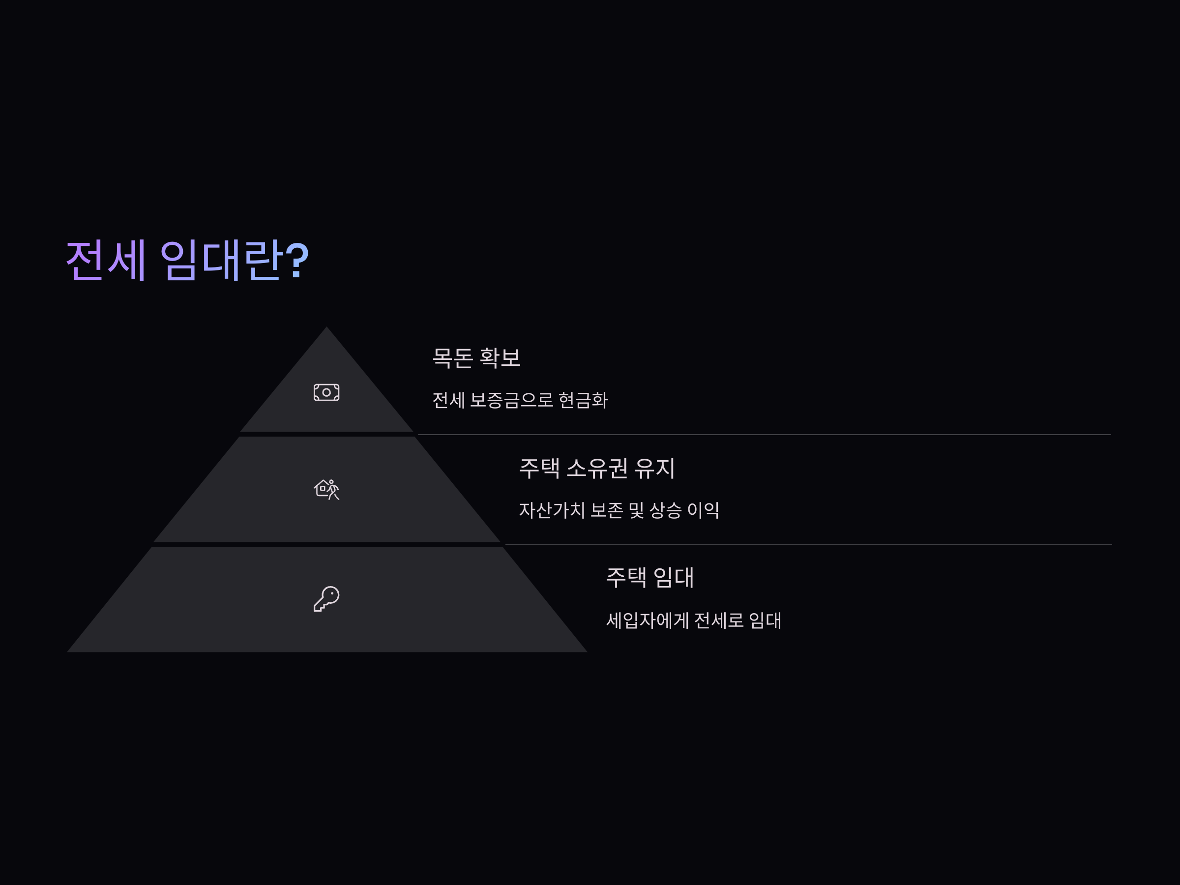 - 목돈 확보: 전세 보증금을 통해 큰 금액의 현금을 확보할 수 있어 다양한 재무 계획을 세울 수 있습니다.