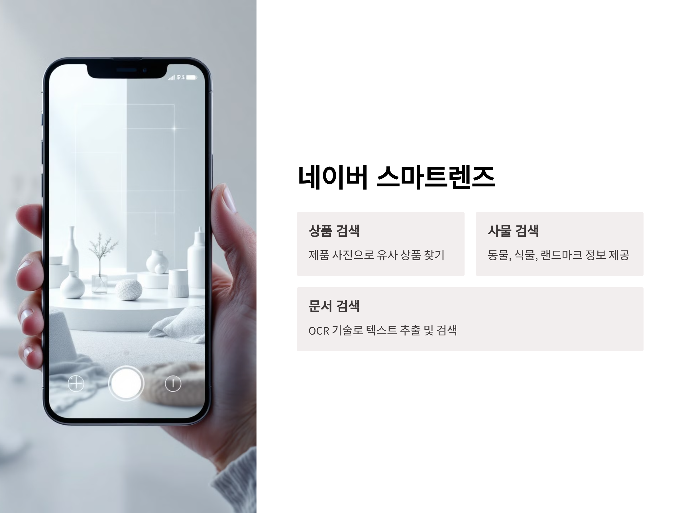 네이버 스마트렌즈는 이미지 검색 기능을 한 단계 업그레이드한 기능으로, 스마트폰 카메라로 촬영한 이미지를 기반으로 검색을 할 수 있습니다.