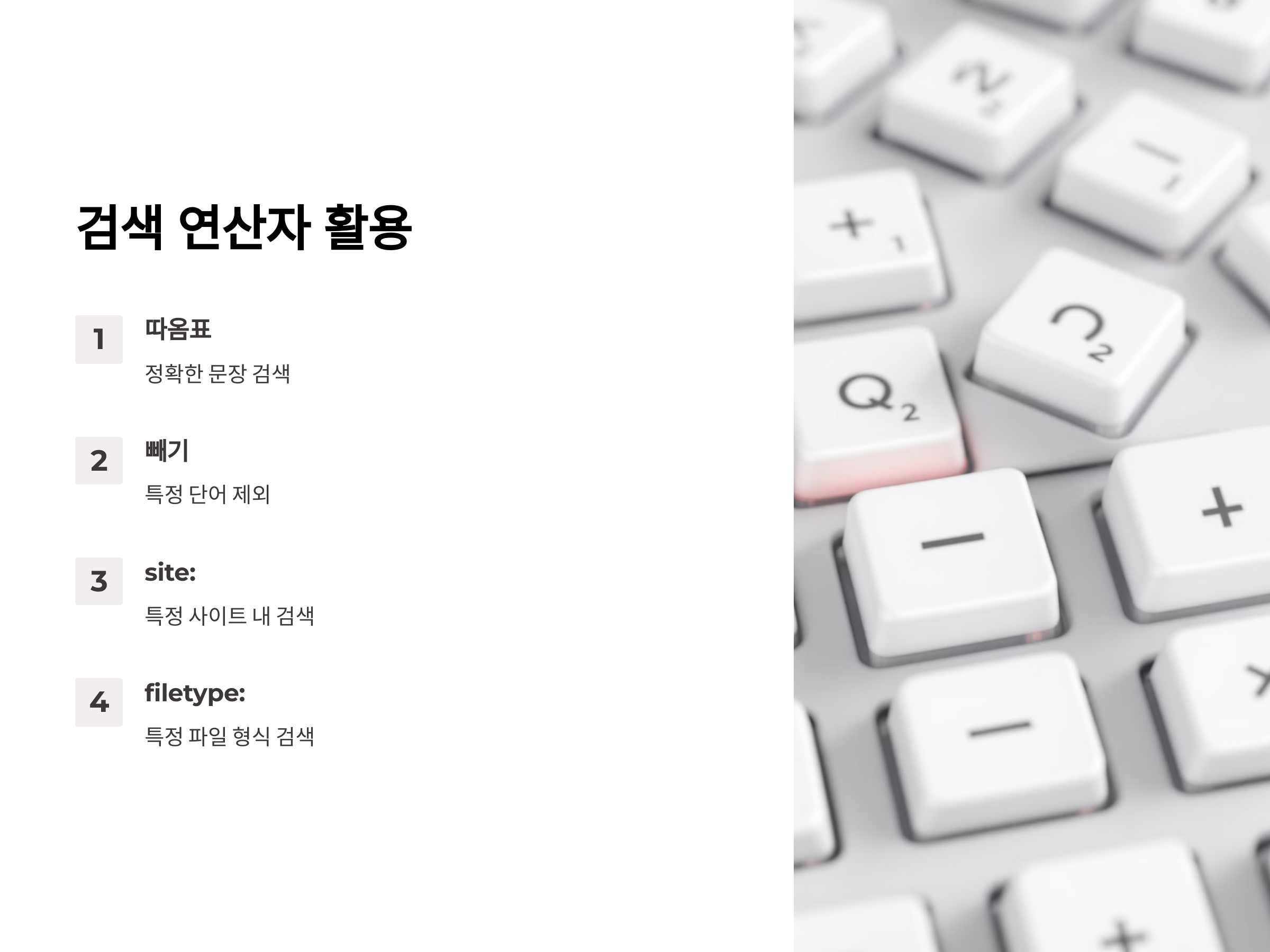 - " (따옴표): 정확히 일치하는 문장을 검색할 때 사용합니다.