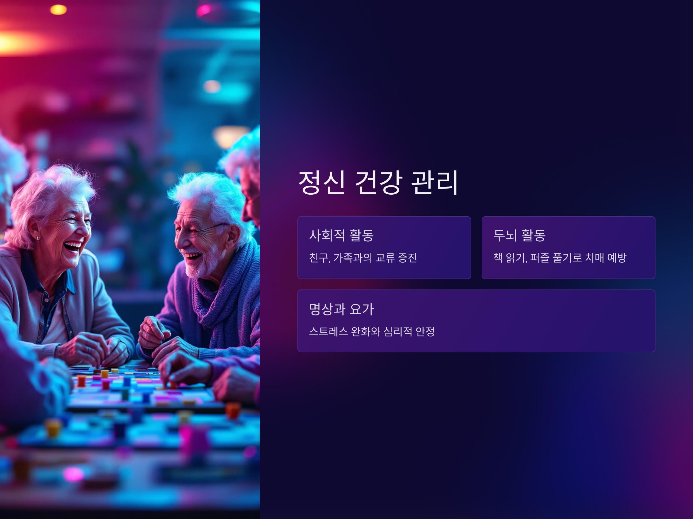 노년기에는 신체 건강뿐만 아니라 정신 건강도 매우 중요합니다. 사회적 활동에 참여하고, 친구나 가족과의 교류를 늘리는 것이 정신적인 건강을 유지하는 데 큰 도움이 됩니다. 외로움과 우울증은 노년기에 흔히 나타나는 문제이기 때문에 이를 예방하기 위해선 적극적인 사회 활동이 필요합니다.