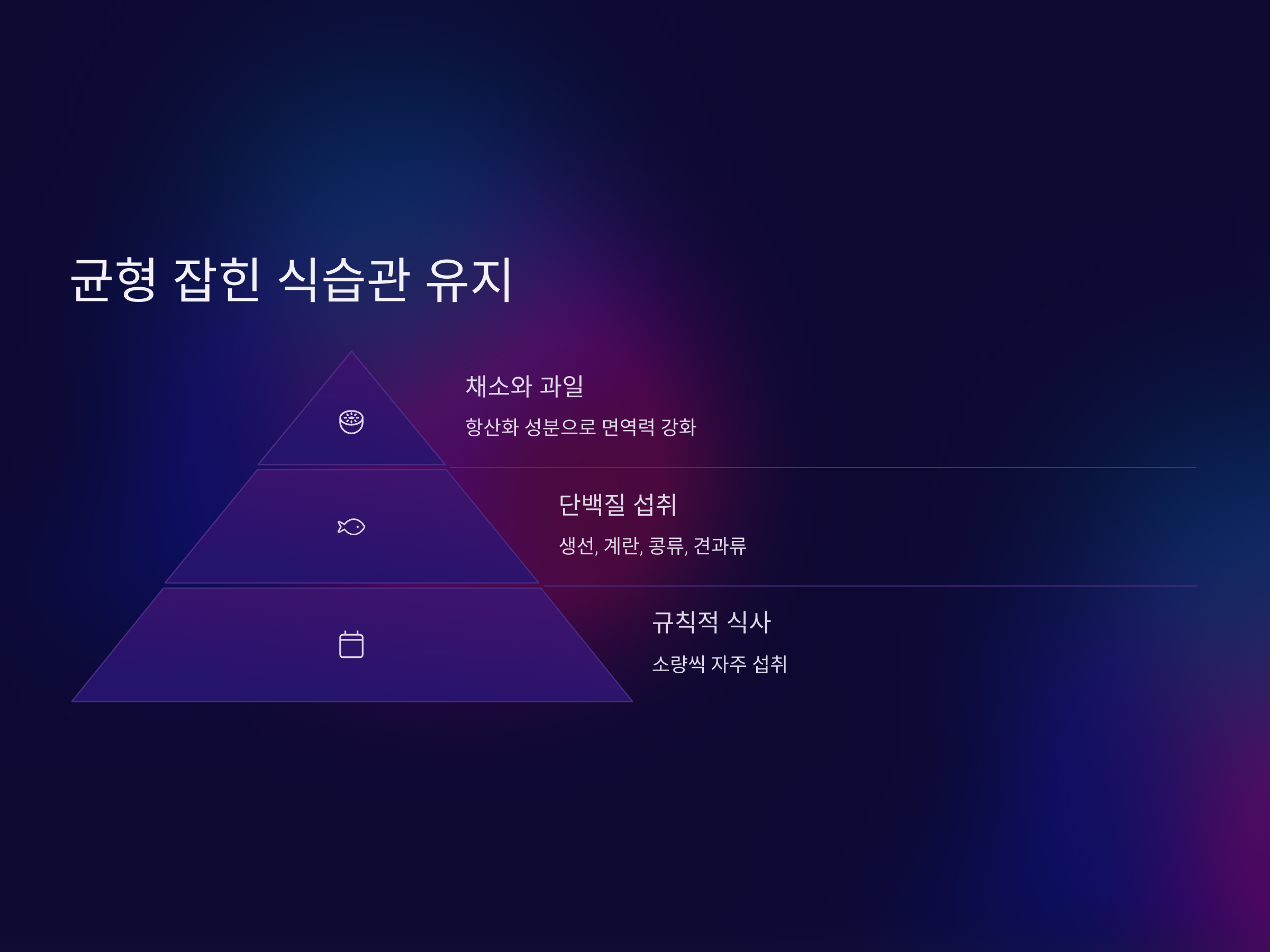 노년기의 건강을 위해서는 균형 잡힌 식사가 필수입니다. 나이가 들수록 식사량이 줄어들고, 영양소를 충분히 섭취하기 어려울 수 있기 때문에, 영양가 있는 음식을 고루 섭취하는 것이 중요합니다. 특히, 단백질, 비타민, 미네랄 등은 뼈와 근육을 건강하게 유지하는 데 큰 역할을 합니다.