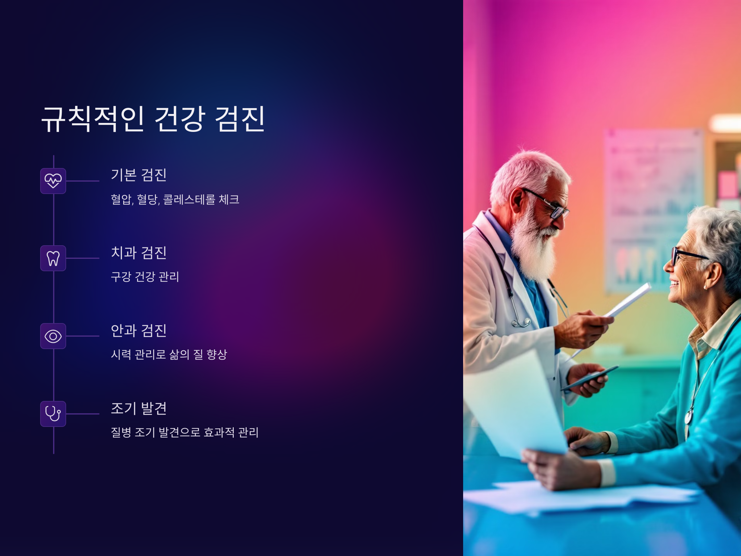 건강 검진을 통해 조기에 질병을 발견하면 더 큰 문제로 발전하기 전에 치료할 수 있어 건강을 더 잘 유지할 수 있습니다. 또한, 정기적으로 치과 검진과 안과 검진을 받는 것도 중요합니다. 시력이나 치아 건강은 노년기 삶의 질에 큰 영향을 미칠 수 있기 때문입니다.