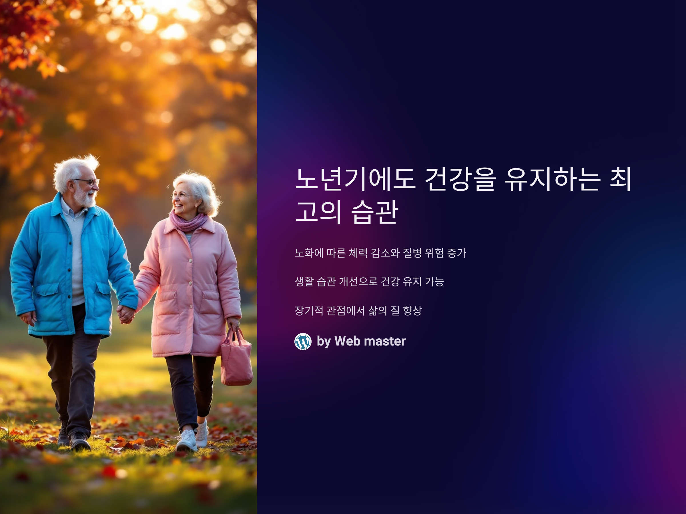 이제부터는 노년기 건강을 유지하는 데 중요한 습관을 자세히 살펴보겠습니다. 운동, 식습관, 정신 건강 관리 등 여러 측면에서 도움이 되는 습관들을 소개할 예정입니다. 또한, 노년기의 주요 건강 위험 요소와 이를 예방하는 방법도 함께 다룰 것입니다. 건강을 유지하는 데 있어서의 핵심은 꾸준함과 올바른 방향으로 생활습관을 개선하는 것입니다.