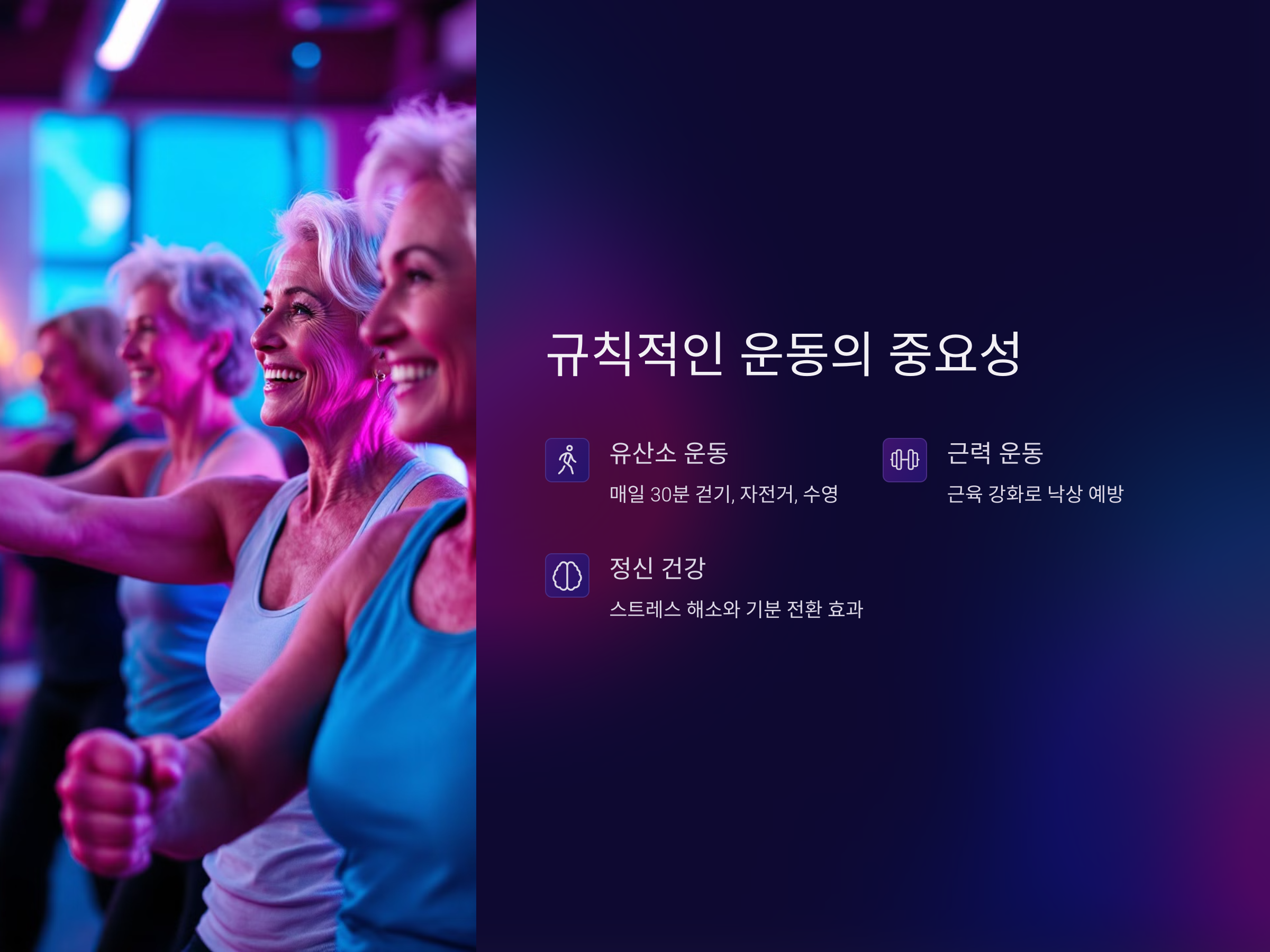 규칙적인 운동은 노년기 건강을 유지하는 데 가장 중요한 요소 중 하나입니다. 나이가 들면서 근육량과 뼈 밀도가 감소하는 경향이 있지만, 운동을 통해 이를 예방하고, 심혈관 건강도 개선할 수 있습니다. 특히, 가벼운 유산소 운동과 근력 운동을 병행하는 것이 중요합니다.