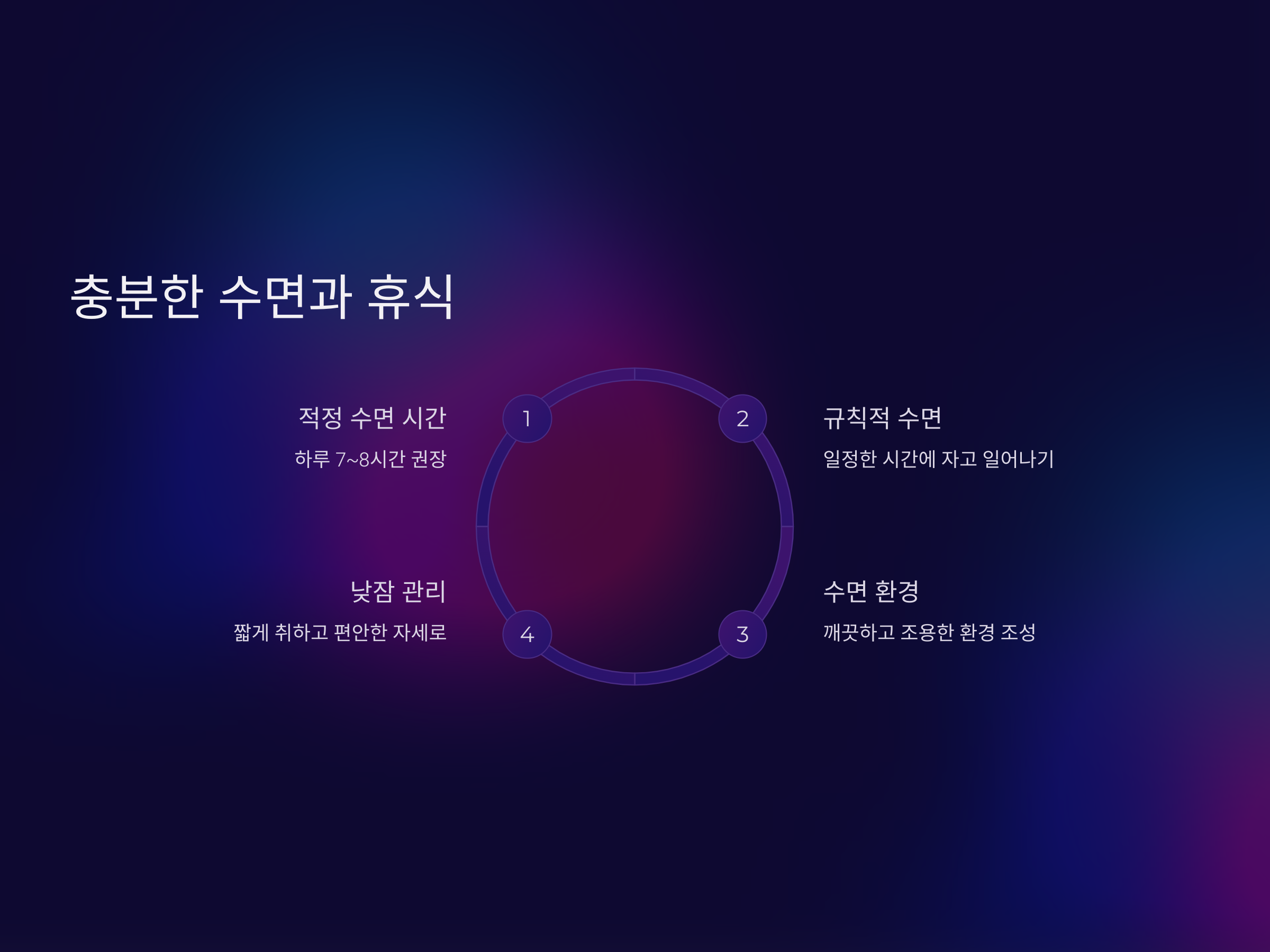 수면은 하루 7~8시간을 권장하며, 일정한 시간에 자고 일어나는 습관을 들이는 것이 좋습니다. 또한, 잠자리 환경을 깨끗하고 조용하게 만들어 수면의 질을 높이는 것도 중요합니다. 낮잠을 자는 경우에도 너무 오래 자지 않도록 주의하고, 편안한 자세로 자는 것이 좋습니다.