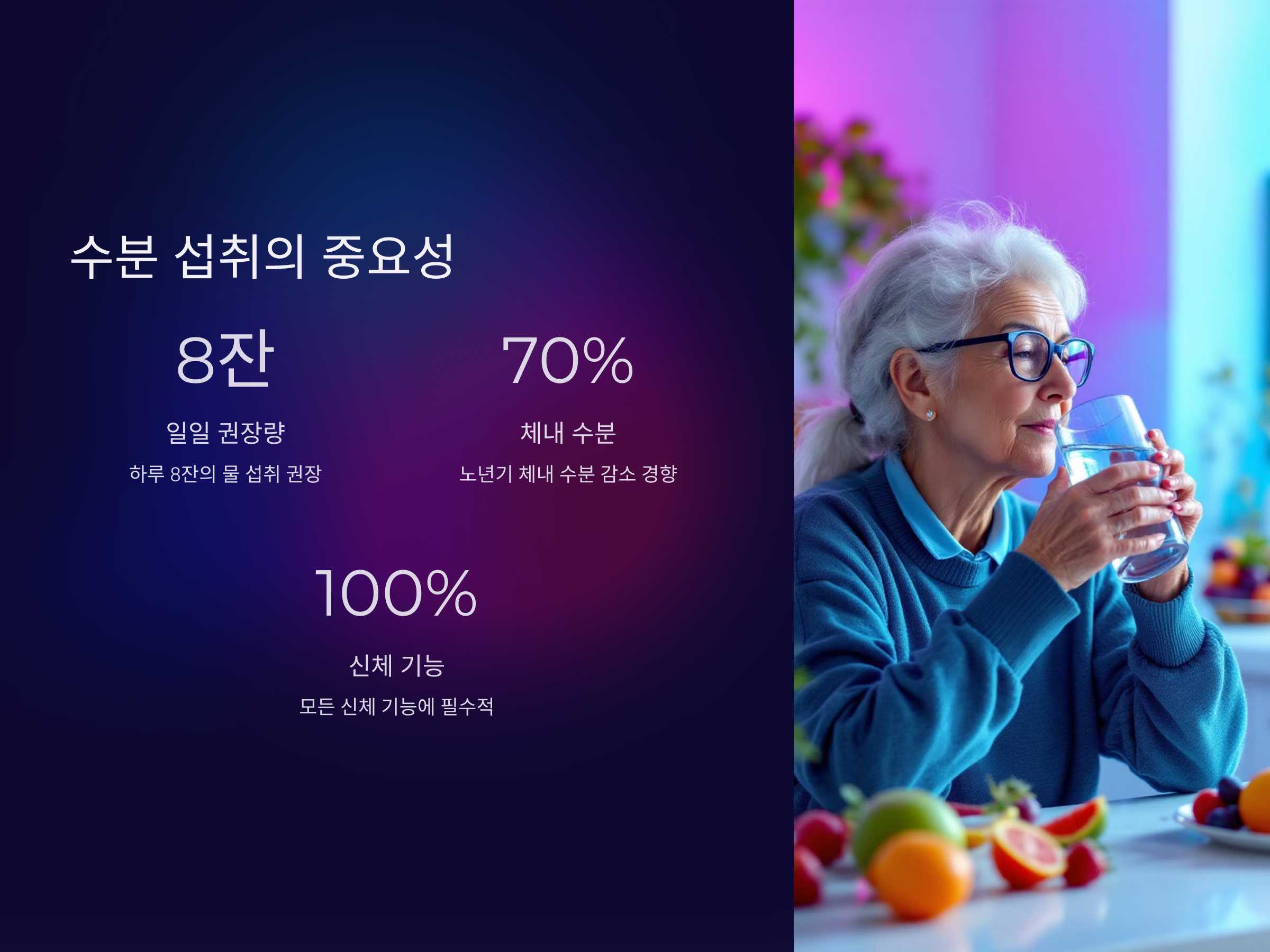 노년기에는 체내 수분이 감소하는 경향이 있어 충분한 수분 섭취가 필요합니다. 물은 신체의 모든 기능을 원활하게 유지하는 데 필수적이므로 하루에 적당량의 물을 마시는 것이 중요합니다. 탈수 상태가 되면 체내 기능이 저하되거나, 피로감을 느끼는 등 여러 가지 부작용이 나타날 수 있습니다.