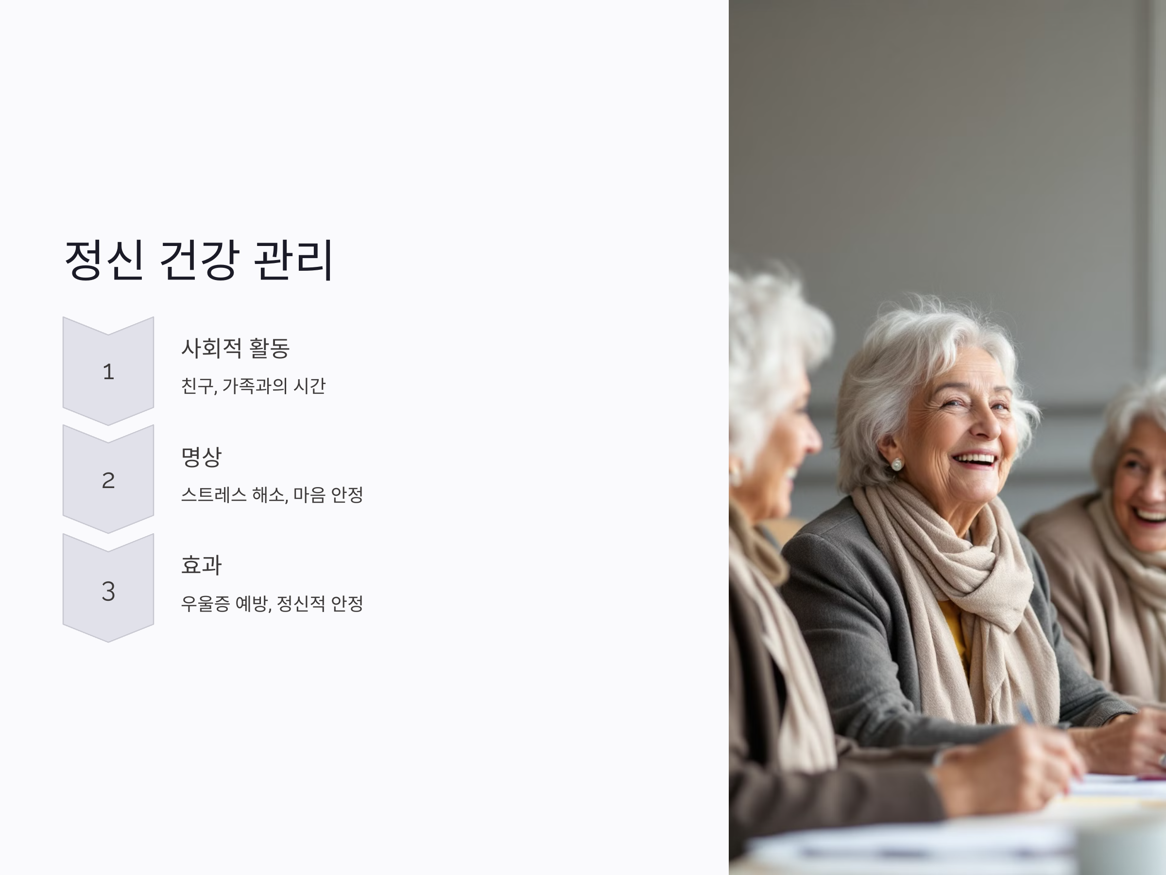 신체 건강만큼이나 정신 건강도 중요합니다. 노년기에 접어들면서 외로움이나 우울증에 시달리기 쉽지만, 이러한 문제를 미리 예방하고 관리하는 것이 필요합니다.