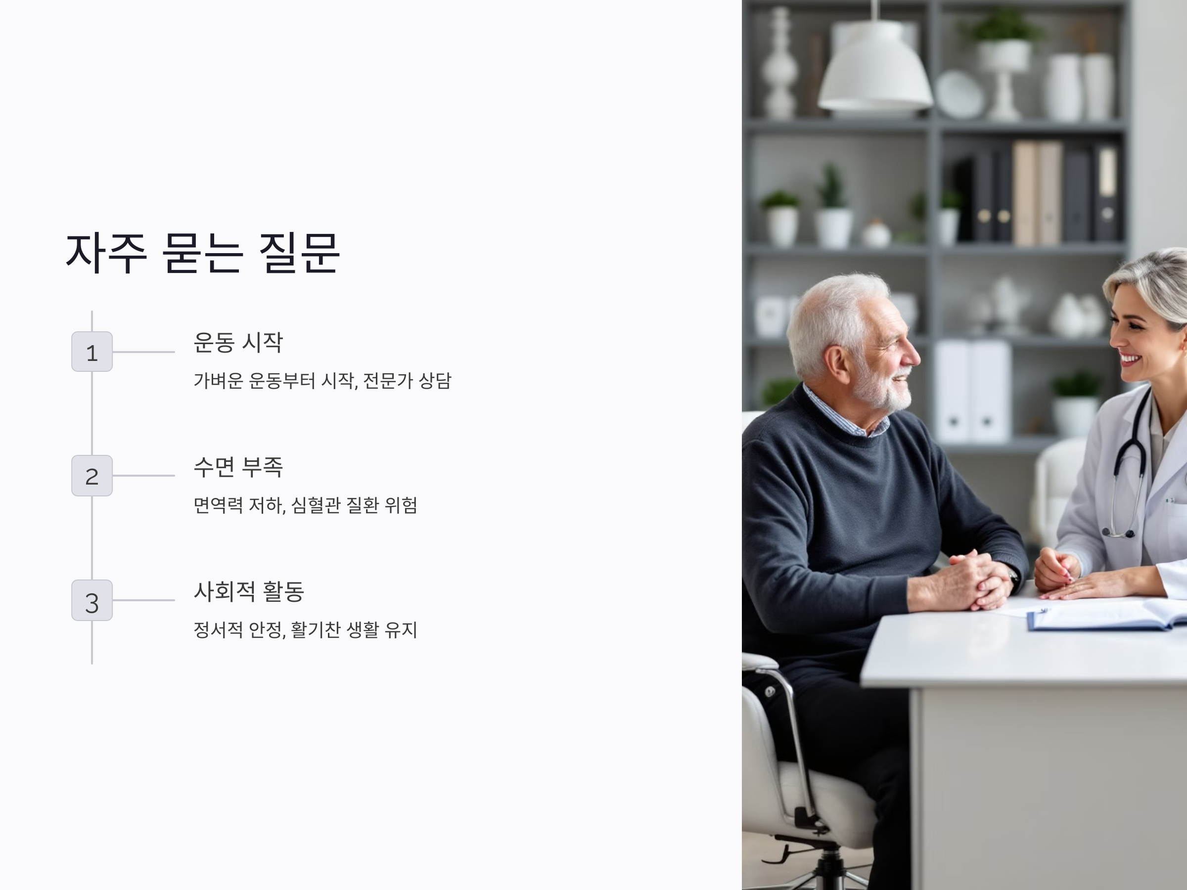 A1: 물론입니다. 노년기에도 운동은 매우 중요합니다. 처음 시작할 때는 가벼운 운동부터 시작하고, 점차 운동 강도를 높여 나가세요. 전문가와 상담하여 자신에게 맞는 운동을 찾는 것이 좋습니다.