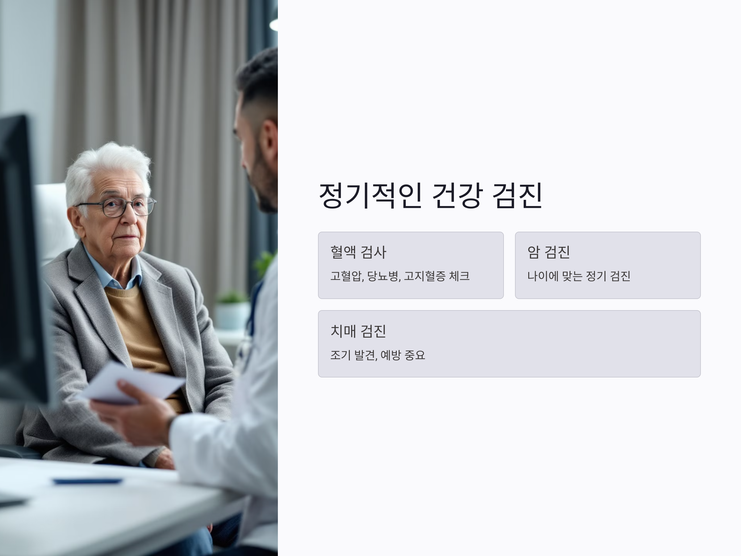 고혈압, 당뇨병, 고지혈증 등은 초기 증상이 미미할 수 있어 정기적인 혈액 검사와 함께 검진을 받는 것이 좋습니다. 또한, 암 검진이나 치매 관련 검진도 나이에 맞춰 체크해야 합니다. 이를 통해 미리 질병을 예방하고 조기에 치료할 수 있습니다.