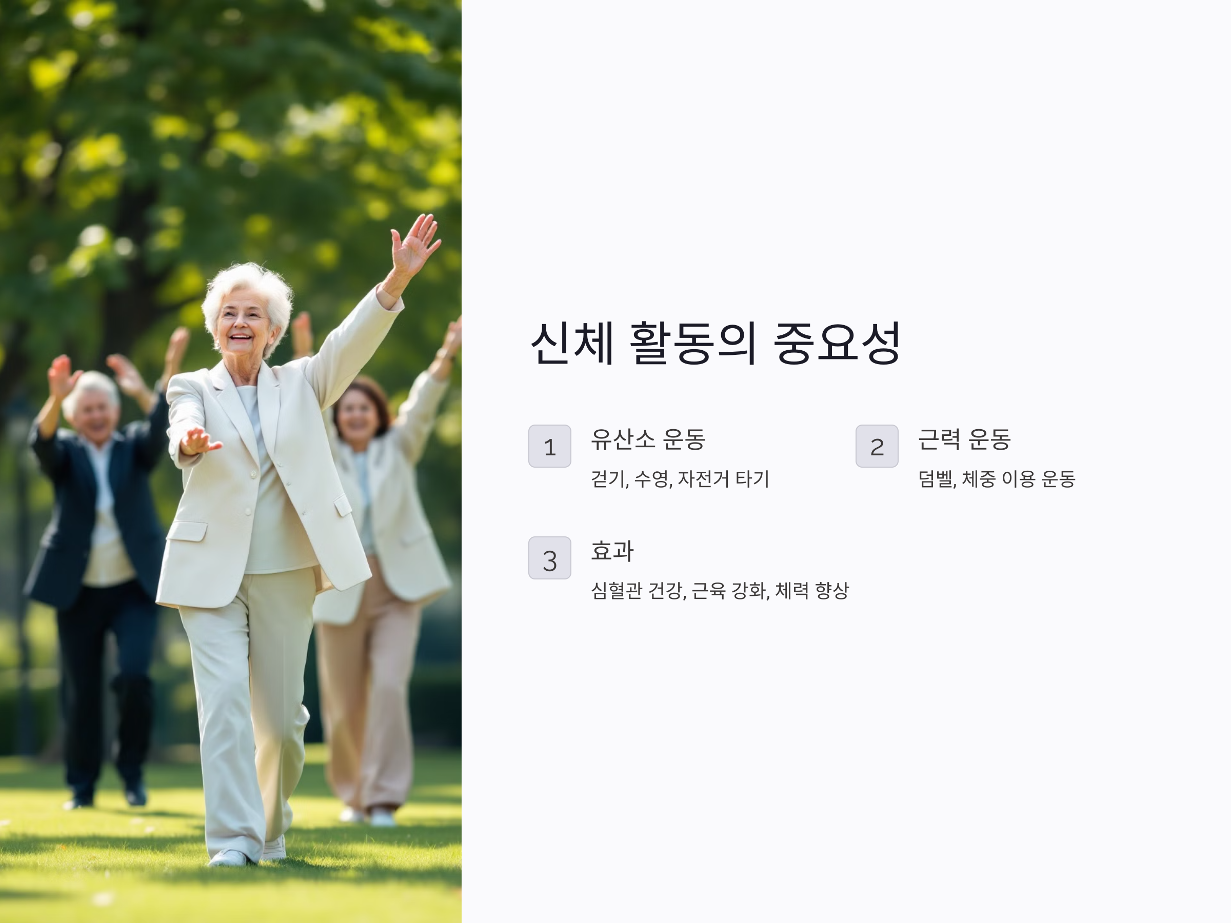운동은 나이가 들수록 더욱 중요해집니다. 노년기에 접어들면 신체 활동량이 자연스럽게 줄어들 수 있지만, 이를 꾸준히 유지하는 것이 중요합니다. 심혈관 건강을 유지하고, 근육과 뼈의 강도를 높이며, 전반적인 체력을 향상시키는 데 운동은 매우 효과적입니다.