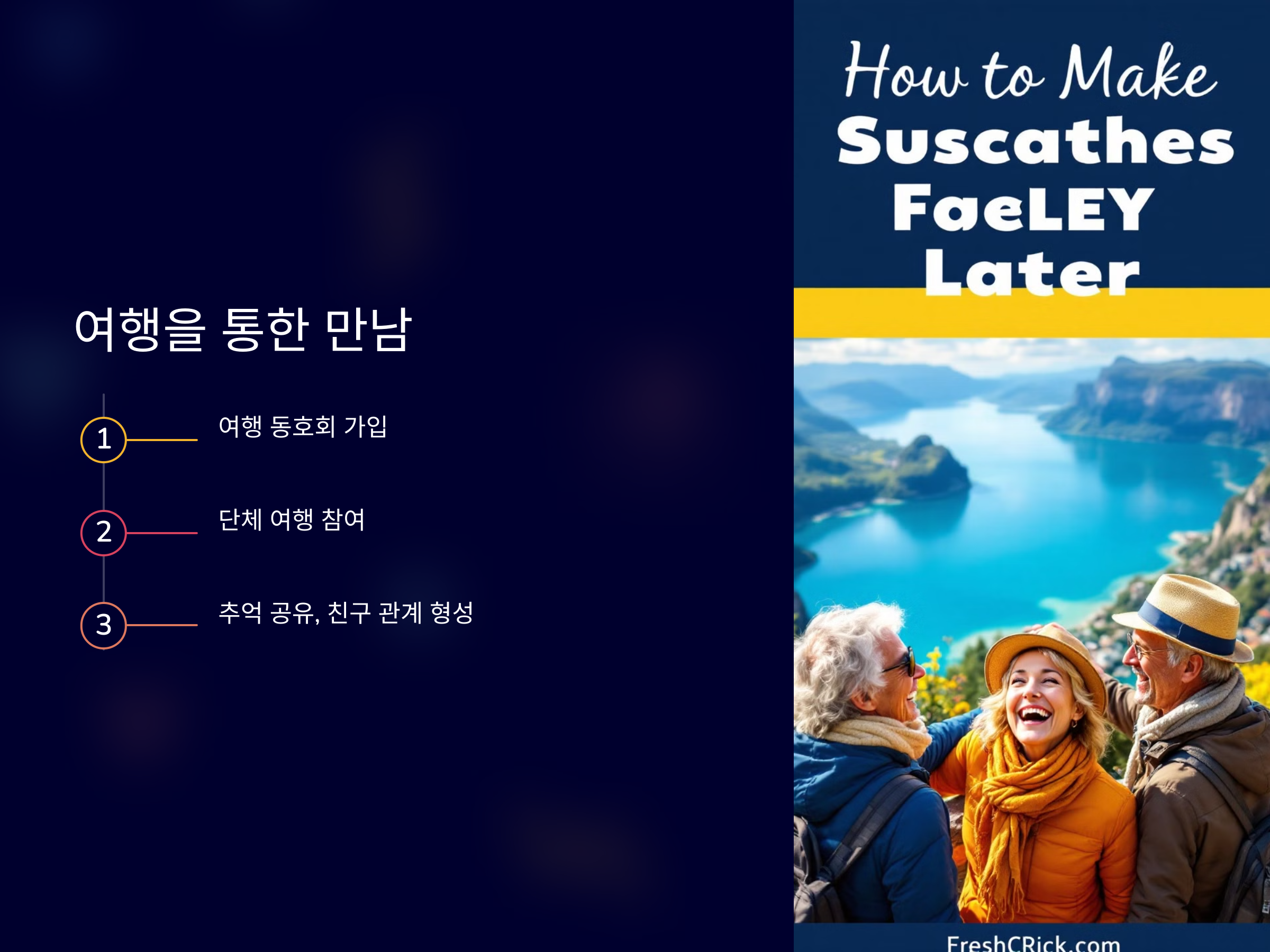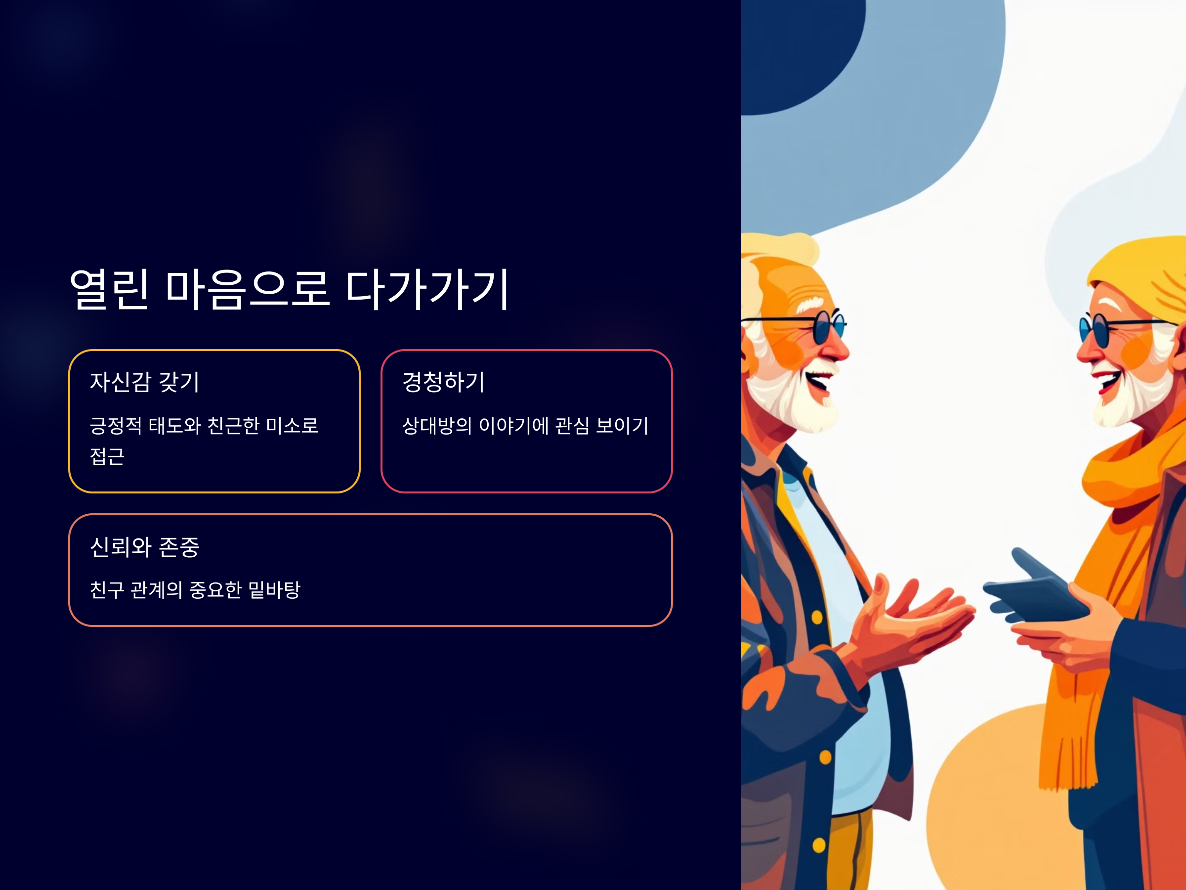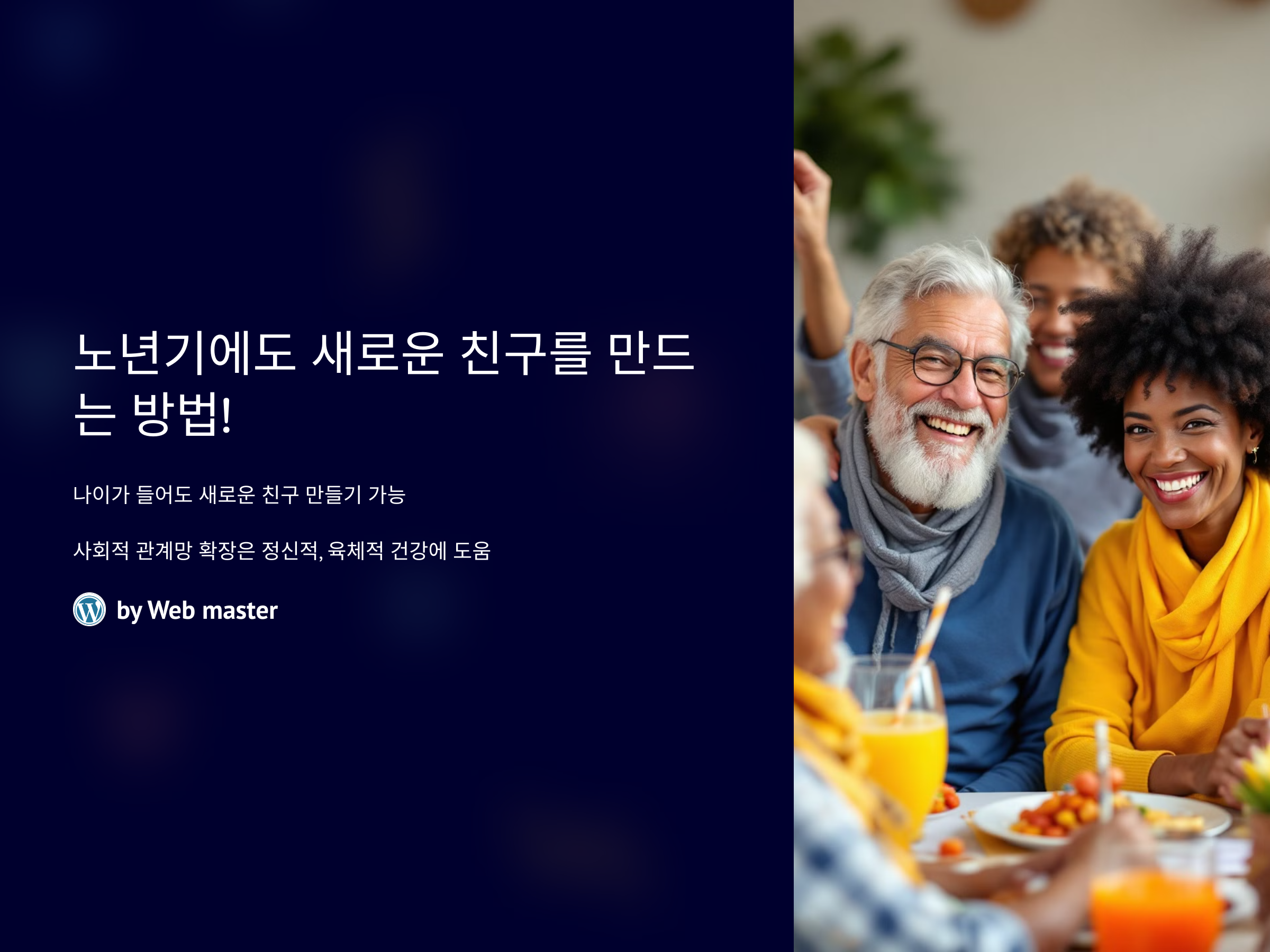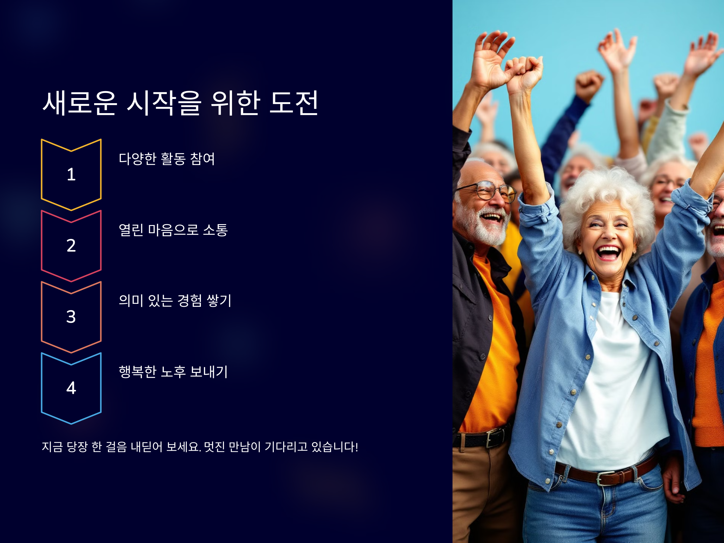 노년기에도 새로운 친구를 만들 수 있는 방법은 충분히 있습니다. 중요한 것은 적극적이고 긍정적인 태도로 새로운 사람들을 만나고, 그들과의 관계를 꾸준히 이어 나가는 것입니다. 여러분의 후반 인생이 더욱 풍성하고 행복한 시간이 될 수 있도록, 다양한 방법을 통해 친구를 만나보세요!