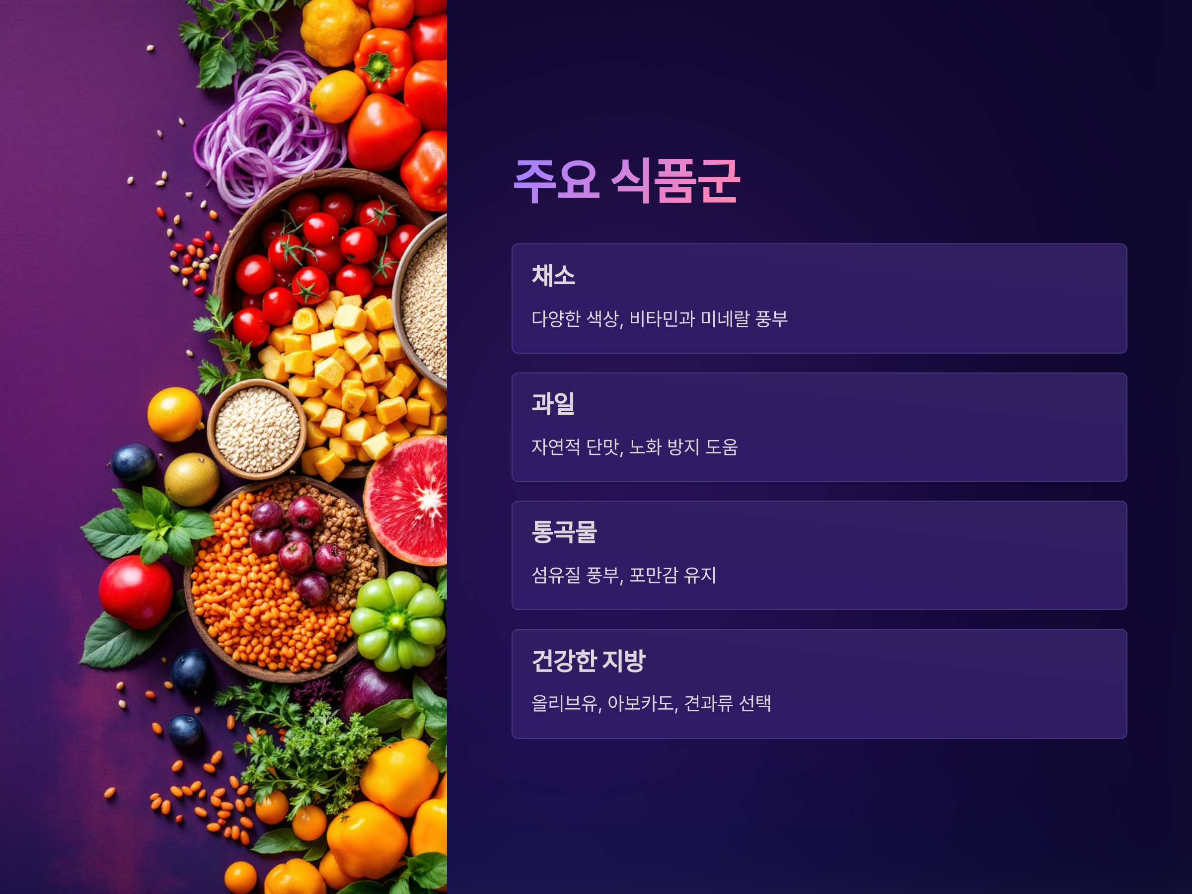- 과일: 과일 역시 비타민과 미네랄이 풍부하며, 자연적인 단맛으로 디저트 대신 활용할 수 있습니다. 블루베리, 사과, 배, 오렌지 등은 노화 방지에도 도움이 됩니다.