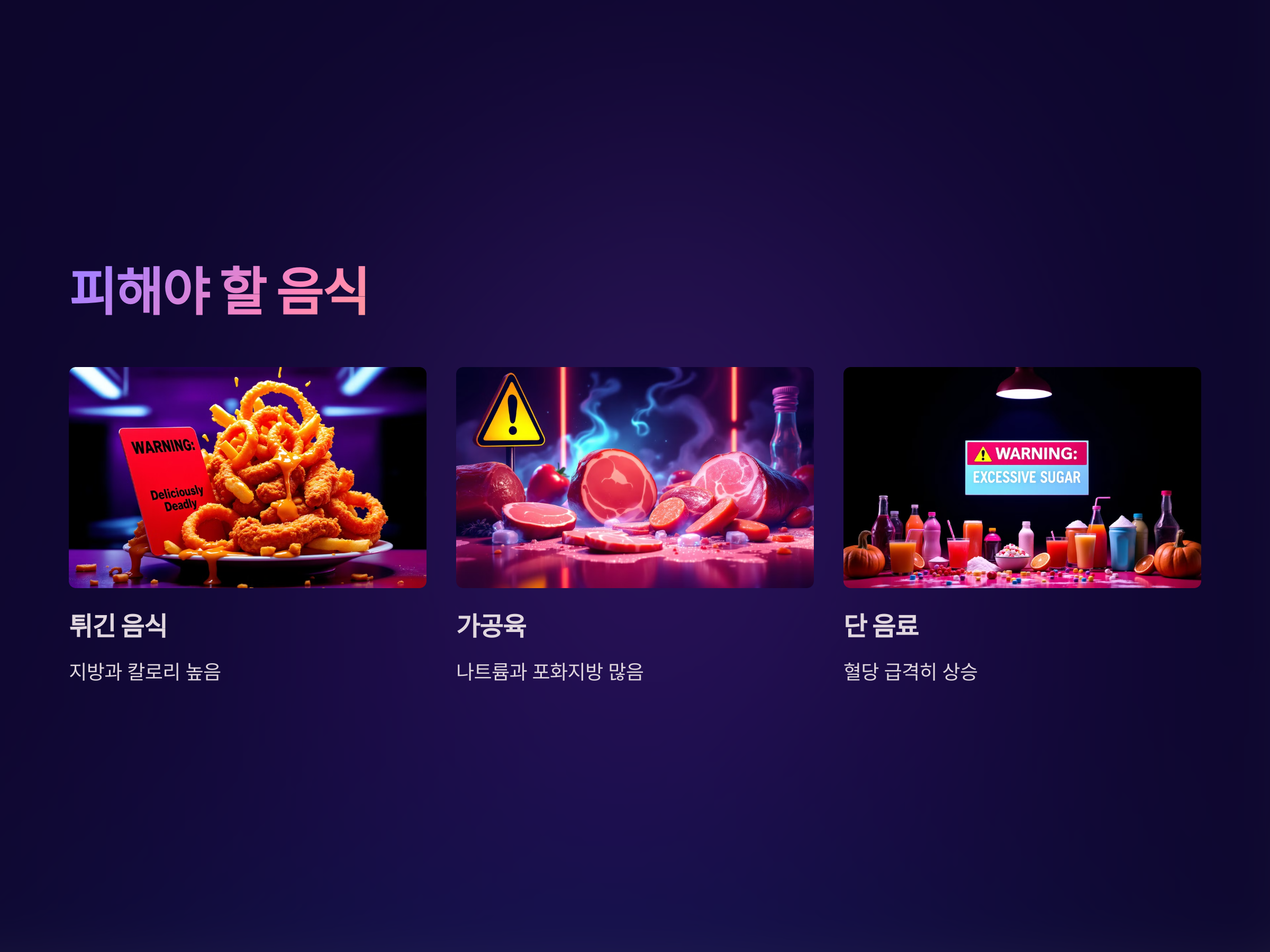 - 가공육: 햄, 소시지, 베이컨 등의 가공육은 나트륨과 포화지방이 많아 심혈관 질환을 초래할 수 있습니다.