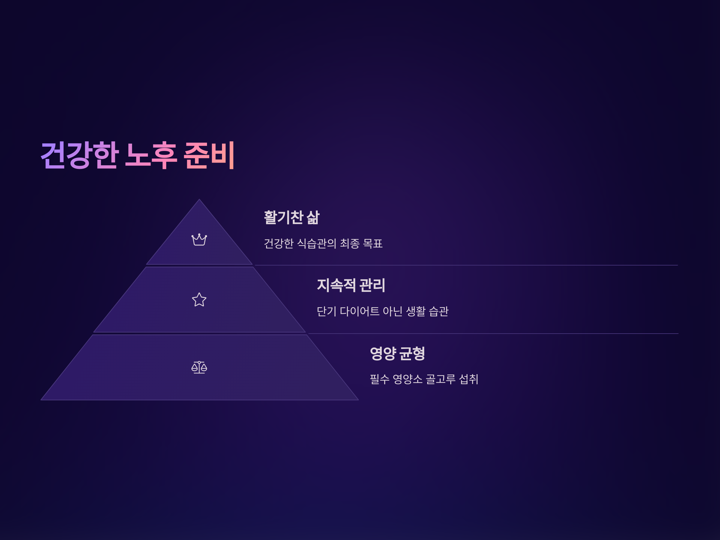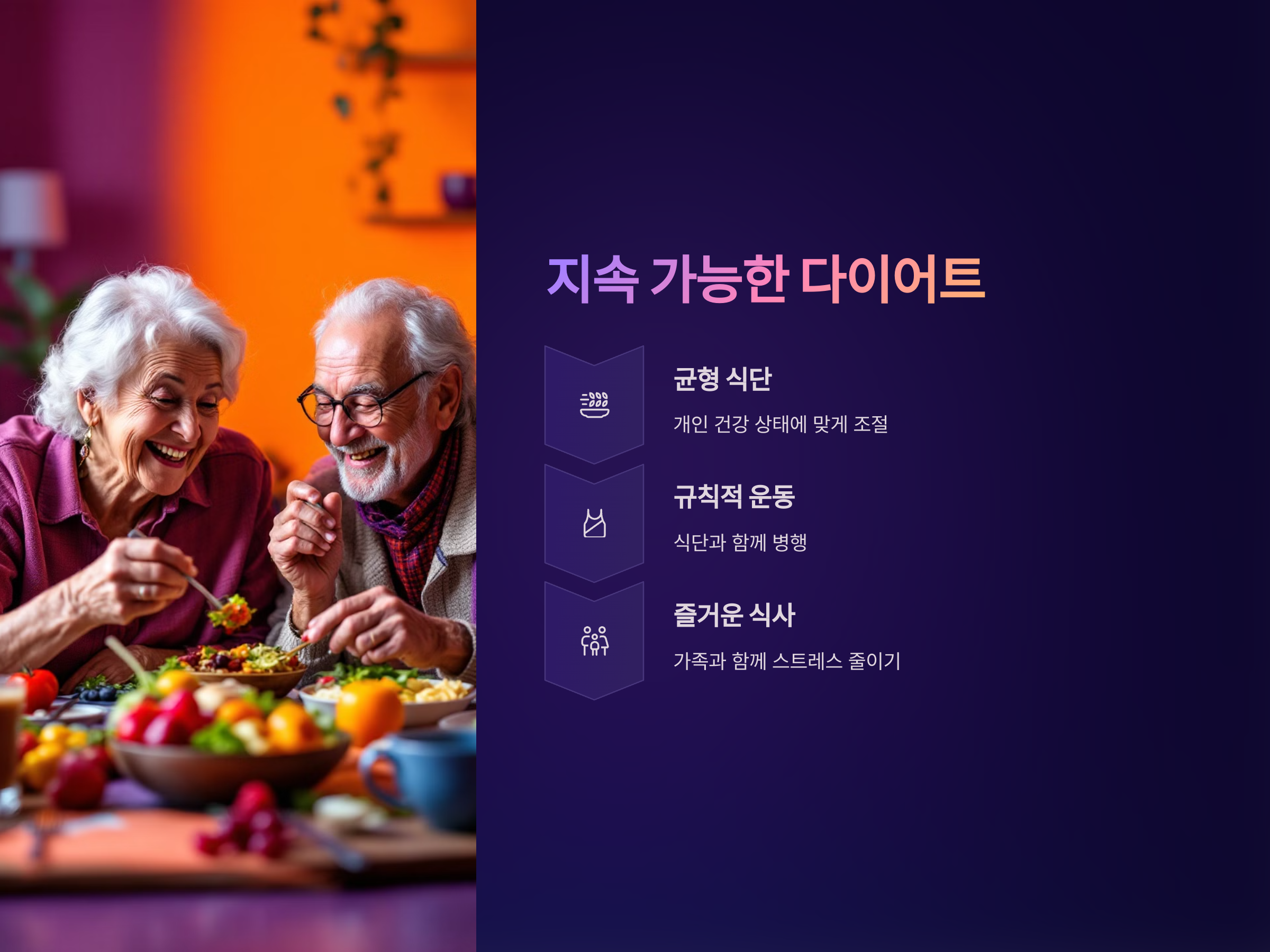 노년기 건강한 다이어트를 위해서는 단기적인 체중 감량이 아닌, 지속 가능한 건강한 식습관을 유지하는 것이 중요합니다. 이를 위해서는 개인의 건강 상태와 라이프스타일에 맞는 식단을 선택하고, 규칙적인 운동을 병행하는 것이 필요합니다. 또한, 식사는 가족과 함께 즐기며 스트레스를 줄이는 것도 중요합니다. 건강한 식습관을 통해 활기차고 건강한 노후를 준비하세요.