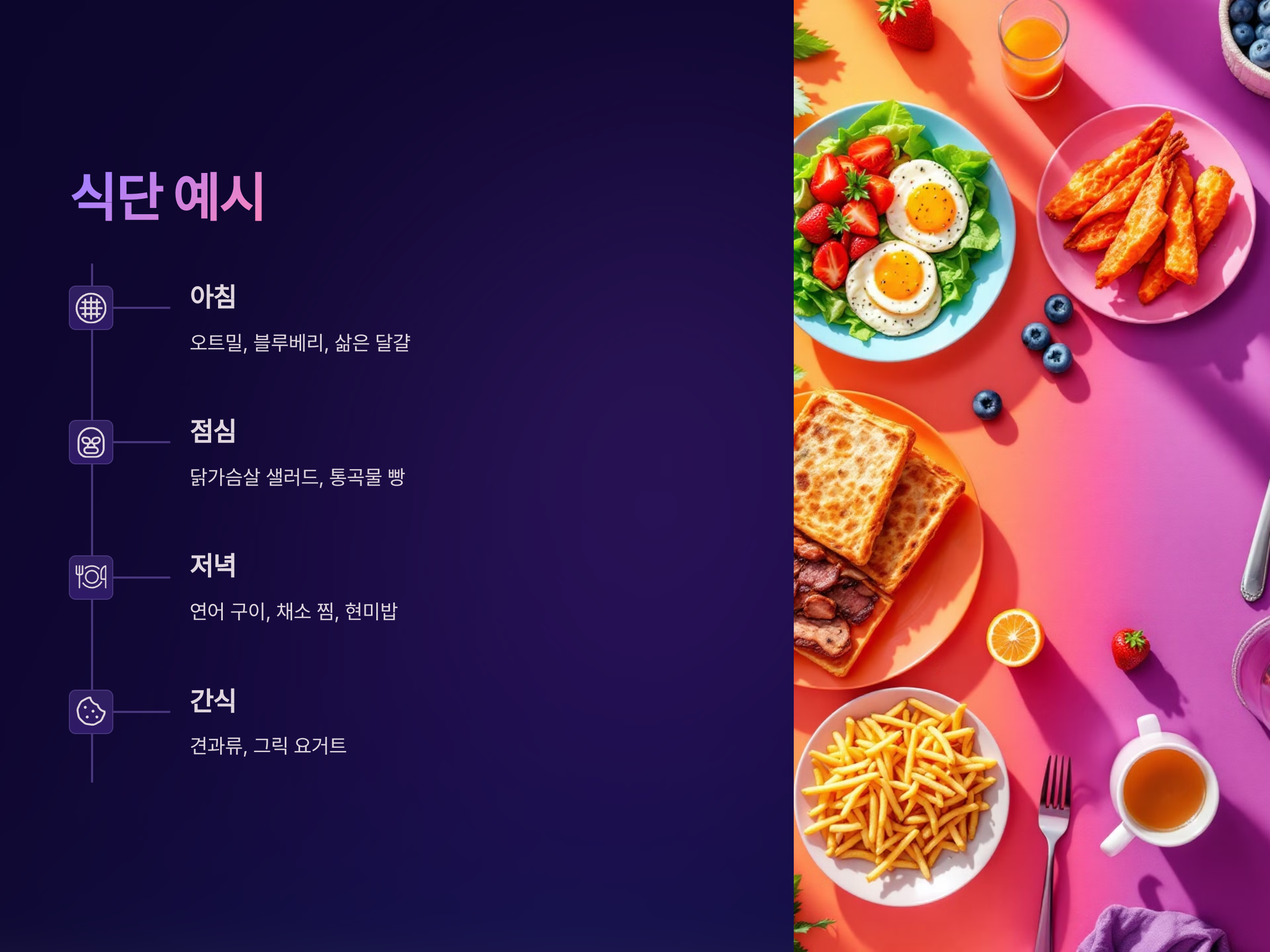 - 채소: 다양한 색상의 채소를 섭취하는 것이 중요합니다. 채소는 칼로리가 낮고, 비타민, 미네랄, 항산화 물질이 풍부합니다. 시금치, 브로콜리, 당근, 고추 등이 좋은 선택입니다.