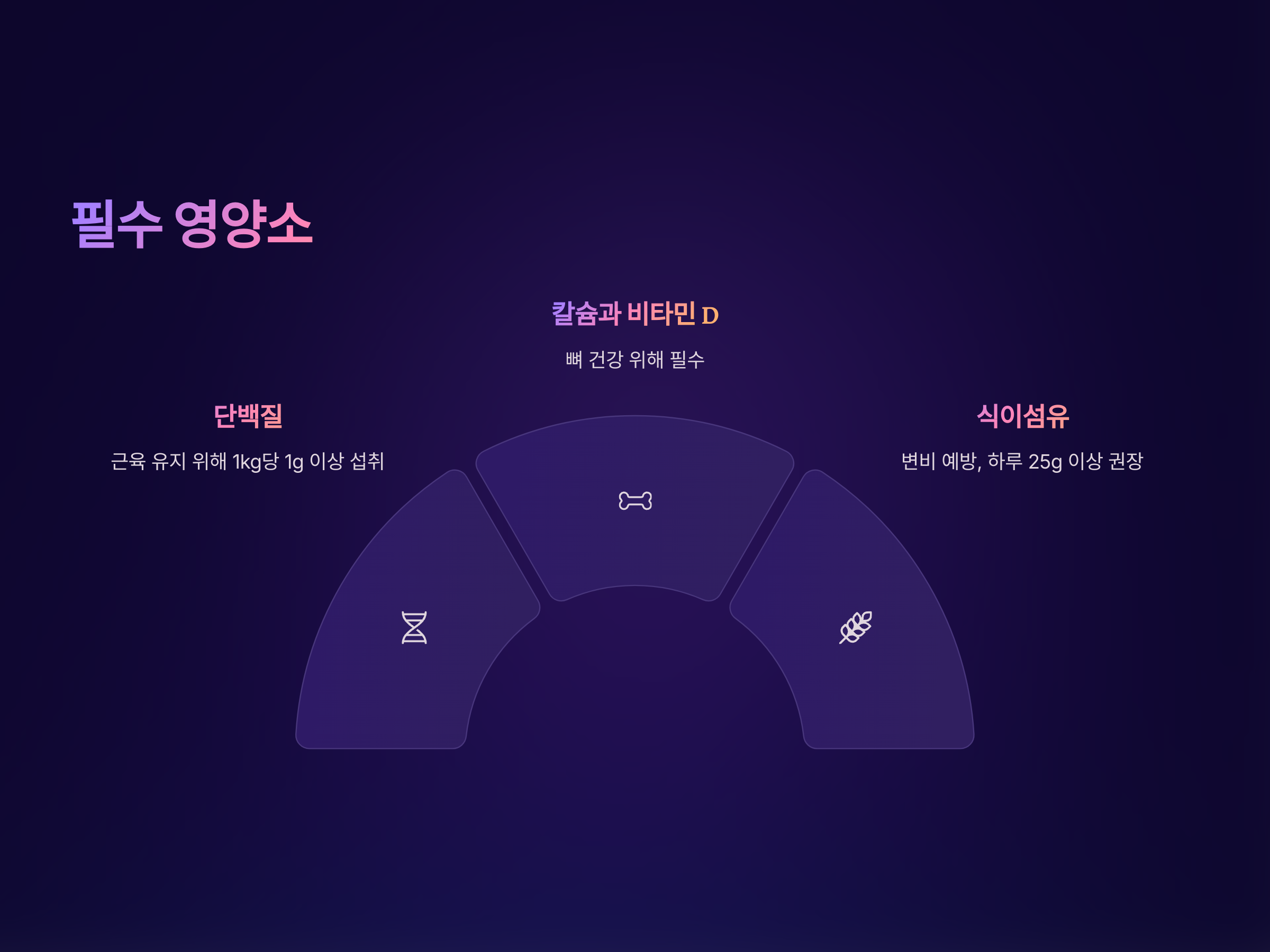 - 칼슘과 비타민 D: 뼈 건강을 위해 칼슘과 비타민 D가 중요합니다. 나이가 들수록 골밀도가 감소하므로, 우유, 요거트, 치즈와 같은 칼슘이 풍부한 식품을 섭취하고, 햇볕을 쬐어 비타민 D를 생성하는 것도 중요합니다.