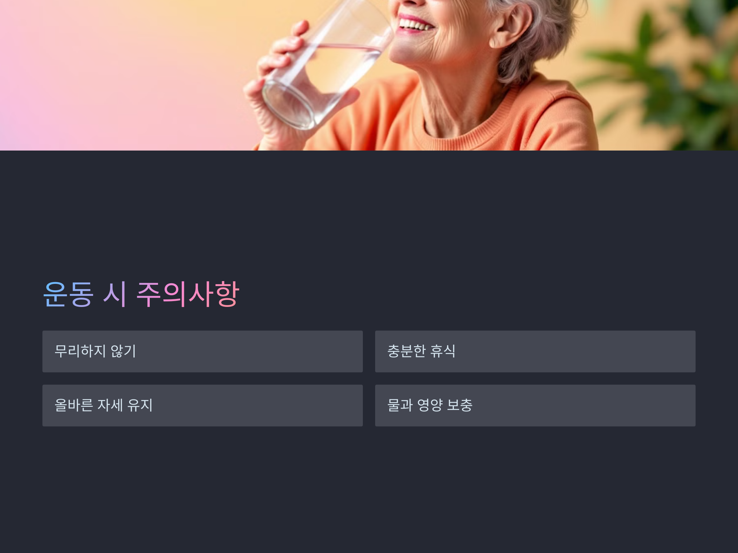 노년기의 운동은 무리하지 않고 점진적으로 진행하는 것이 핵심입니다. 운동을 처음 시작했다면, 가벼운 세트로 시작해 점차적으로 횟수와 강도를 늘려가세요.