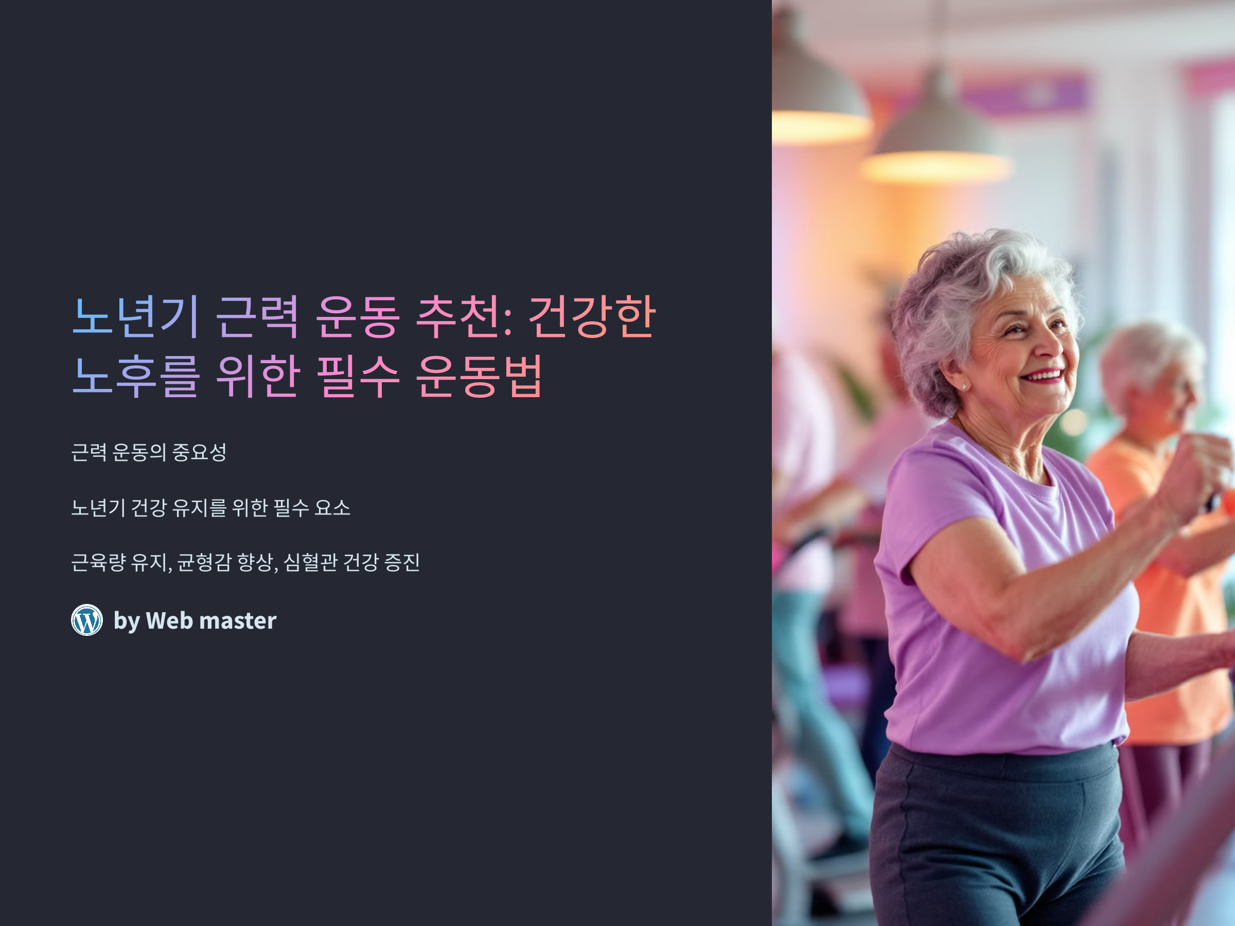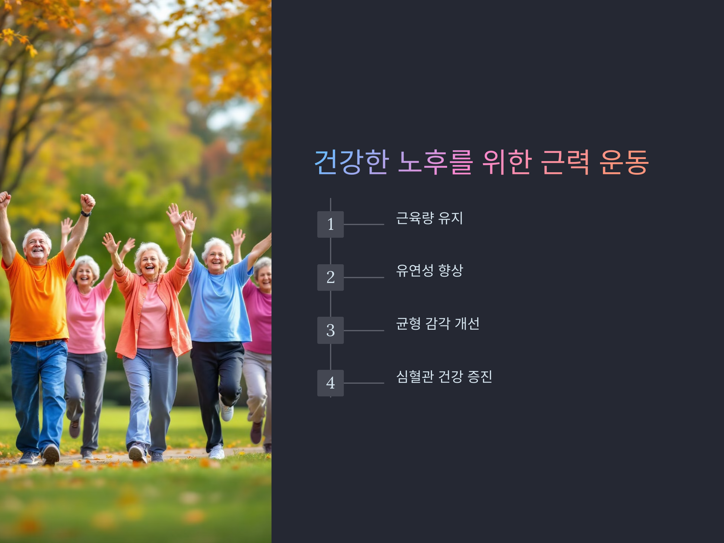 근력 운동은 노년기에 필수적인 운동으로, 몸의 기능을 유지하고 활력 넘치는 생활을 위해서 꼭 필요합니다. 적절한 운동을 통해 건강한 노후를 준비하고, 자립적인 삶을 유지할 수 있습니다. 운동을 꾸준히 실천하여 더 건강하고 활기찬 일상을 보내세요!