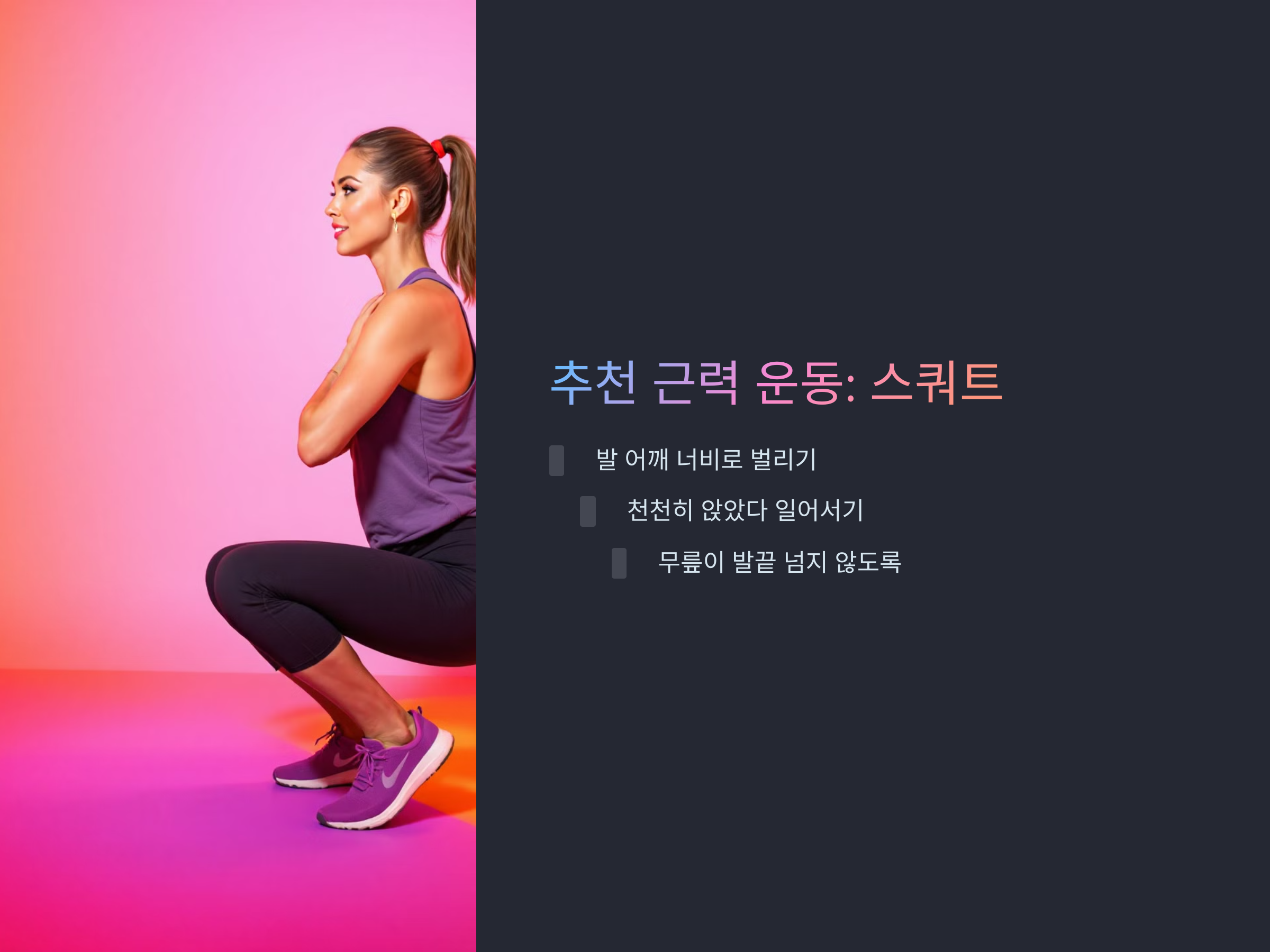 - 방법: 발을 어깨 너비로 벌리고, 무릎이 발끝을 넘지 않도록 하면서 천천히 앉았다 일어섭니다. 허리를 곧게 펴고, 엉덩이가 무릎과 같은 높이가 될 때까지 앉습니다.