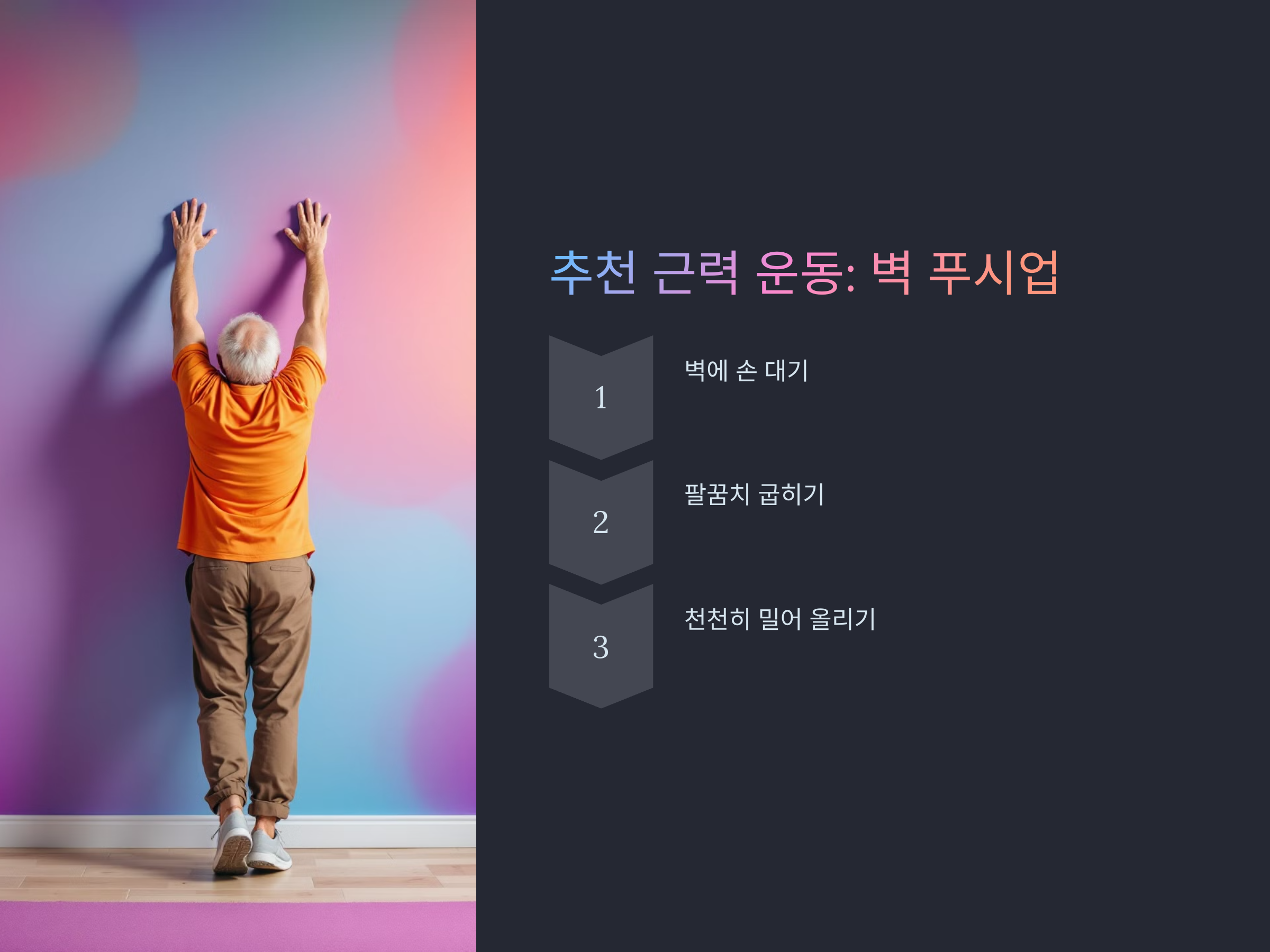 푸시업은 상체 근력 운동으로, 팔꿈치와 어깨를 강화하는 데 좋습니다. 벽을 이용한 푸시업은 노년기에도 안전하게 할 수 있습니다.