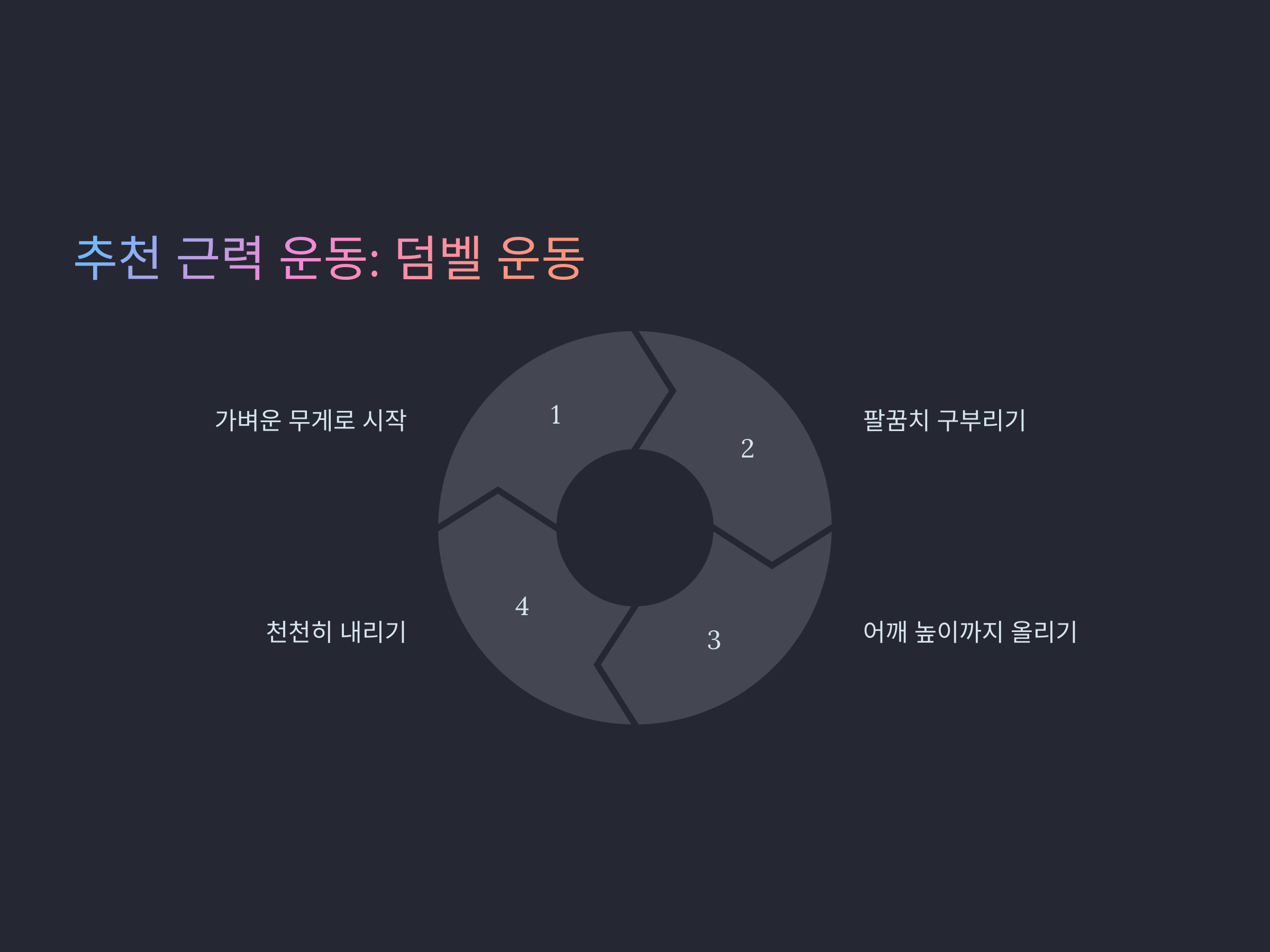 덤벨을 활용한 운동은 상체와 하체 근육을 균형 있게 강화하는 데 유용합니다. 무게는 가벼운 것으로 시작하여 점차 늘려가세요.