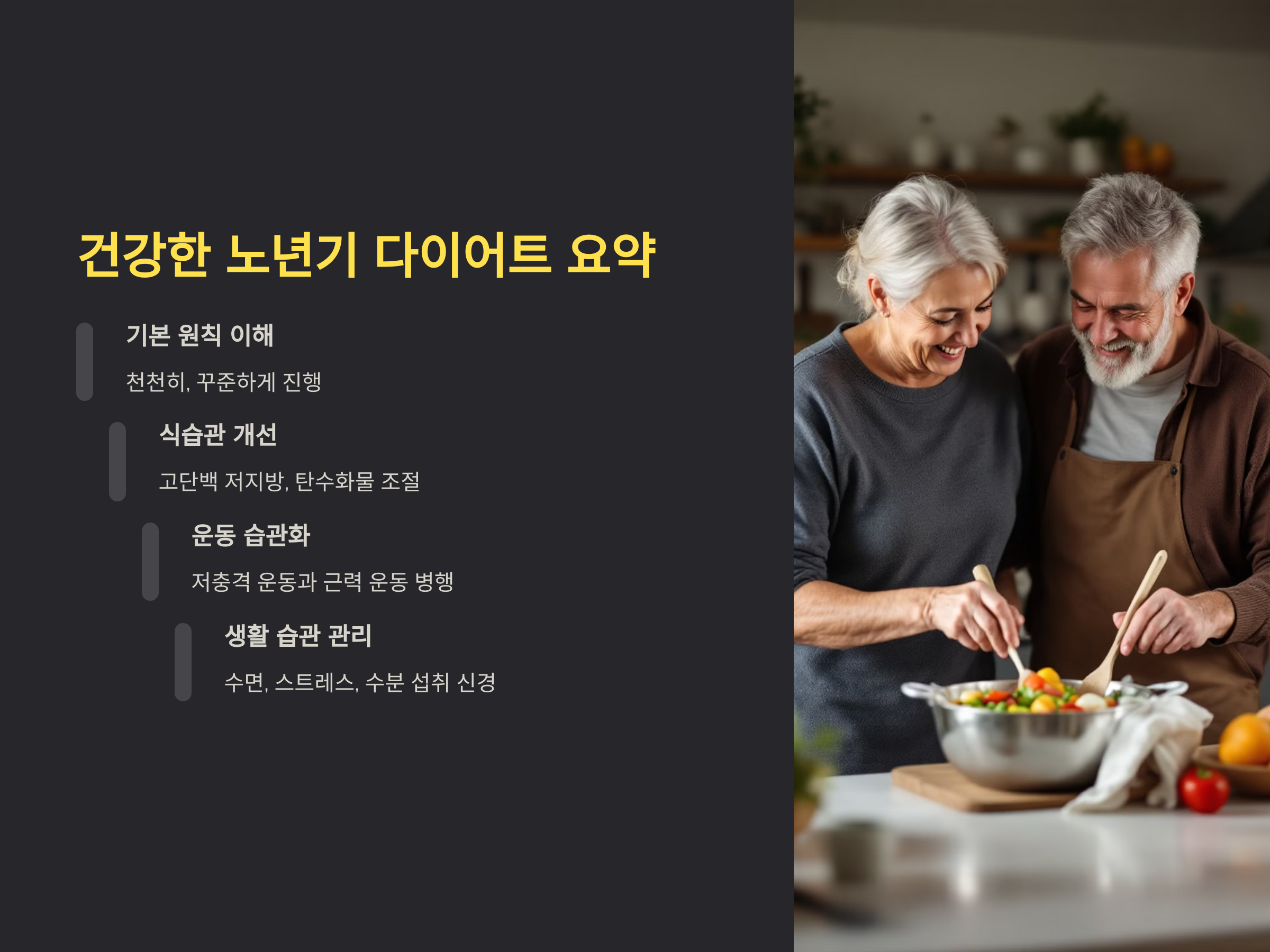 노년기에는 체중 감량에 있어 과도한 다이어트보다는 천천히, 꾸준하게 체중을 조절하는 것이 중요합니다. 나이가 들수록 신진대사가 느려지고, 근육량이 줄어들기 때문에 급격한 체중 감소는 근육 손실이나 뼈 건강에 영향을 미칠 수 있습니다. 따라서 칼로리 섭취를 적절히 줄이고, 운동을 통해 근육량을 유지하는 것이 핵심입니다.