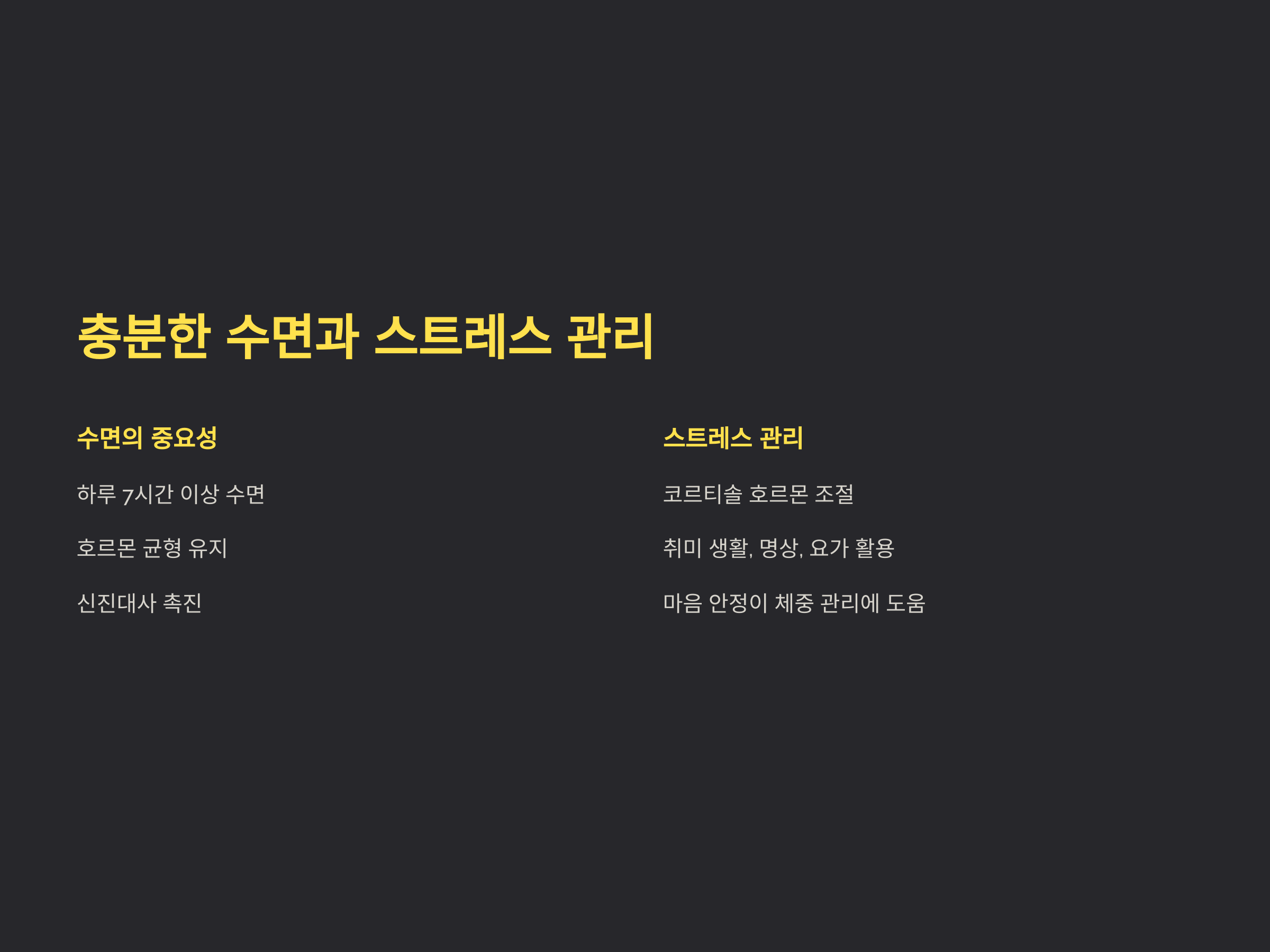 노년기의 체중 관리에서 간과해서는 안 되는 부분이 바로 충분한 수면과 스트레스 관리입니다. 수면 부족은 호르몬 불균형을 일으켜 과식을 유발하거나 신진대사를 방해할 수 있습니다. 하루 7시간 이상의 충분한 수면을 취하는 것이 중요합니다.