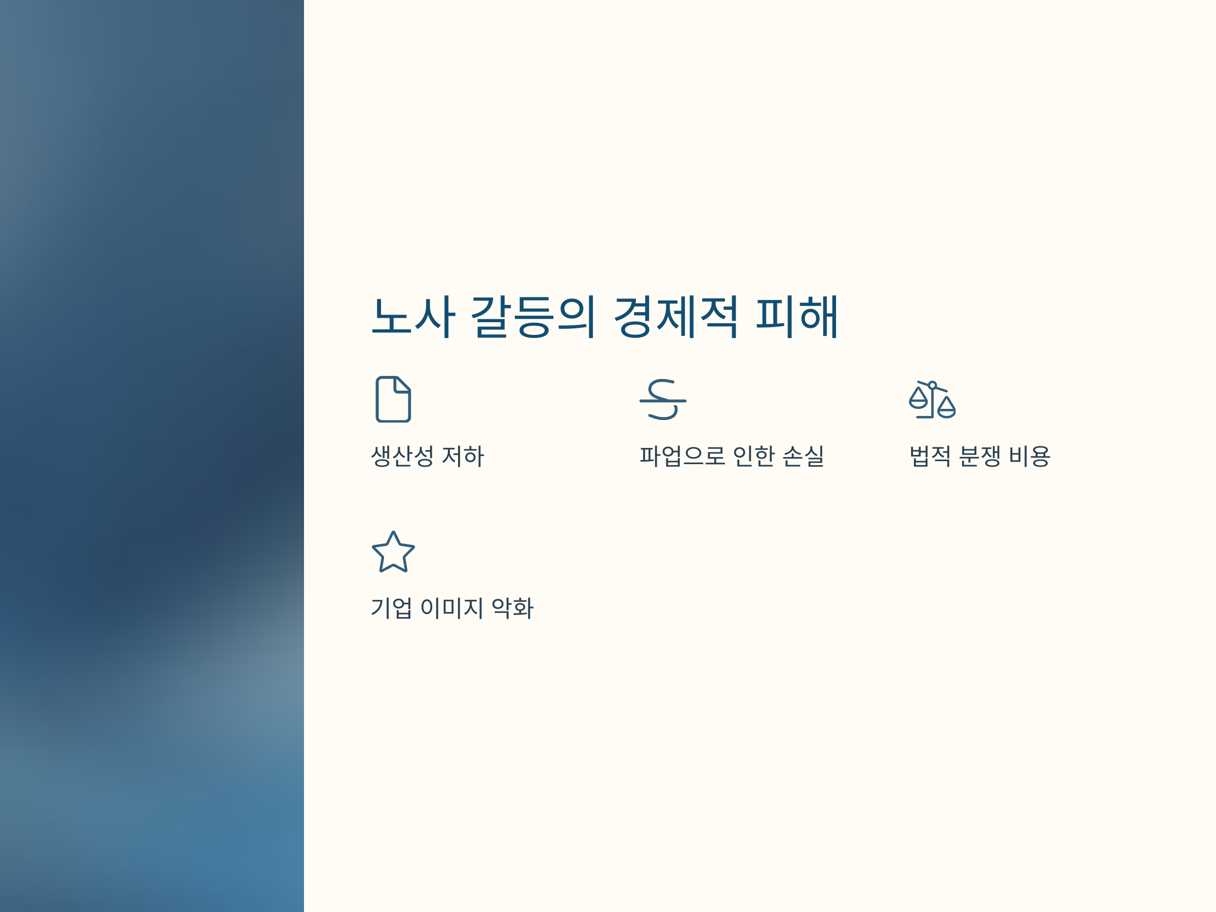 노사 갈등이 기업에 미치는 경제적 피해는 상당히 클 수 있습니다. 생산성 저하, 파업, 법적 분쟁 등은 모두 기업에 경제적 손실을 초래합니다. 특히 장기화된 갈등은 기업 이미지에 악영향을 미치며, 노동자들의 이탈을 초래할 수 있습니다. 따라서 빠르게 갈등을 해결하는 것이 기업의 경제적 안정성을 유지하는 데 필수적입니다.