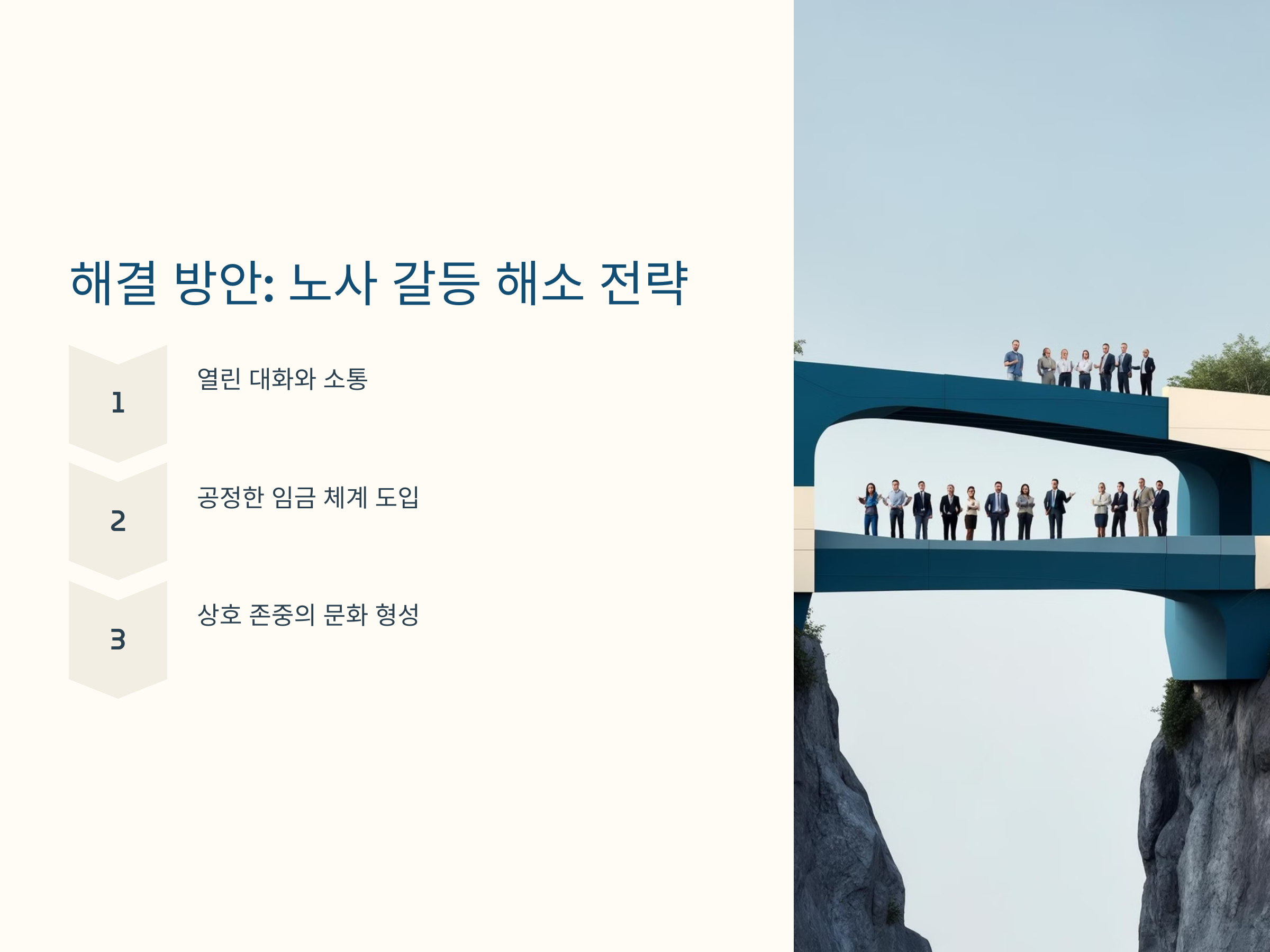 노사 갈등을 해결하기 위한 첫 번째 방법은 경영진과 노동자 간의 열린 대화입니다. 경영진은 노동자들의 불만과 요구 사항을 정확히 이해하고, 이를 해결할 수 있는 방법을 모색해야 합니다. 노동자들도 자신의 요구가 기업의 목표와 어떻게 연결될 수 있는지에 대해 이해할 필요가 있습니다. 이렇게 상호 이해가 바탕이 된다면 갈등을 최소화하고, 생산성 향상으로 이어질 수 있습니다.