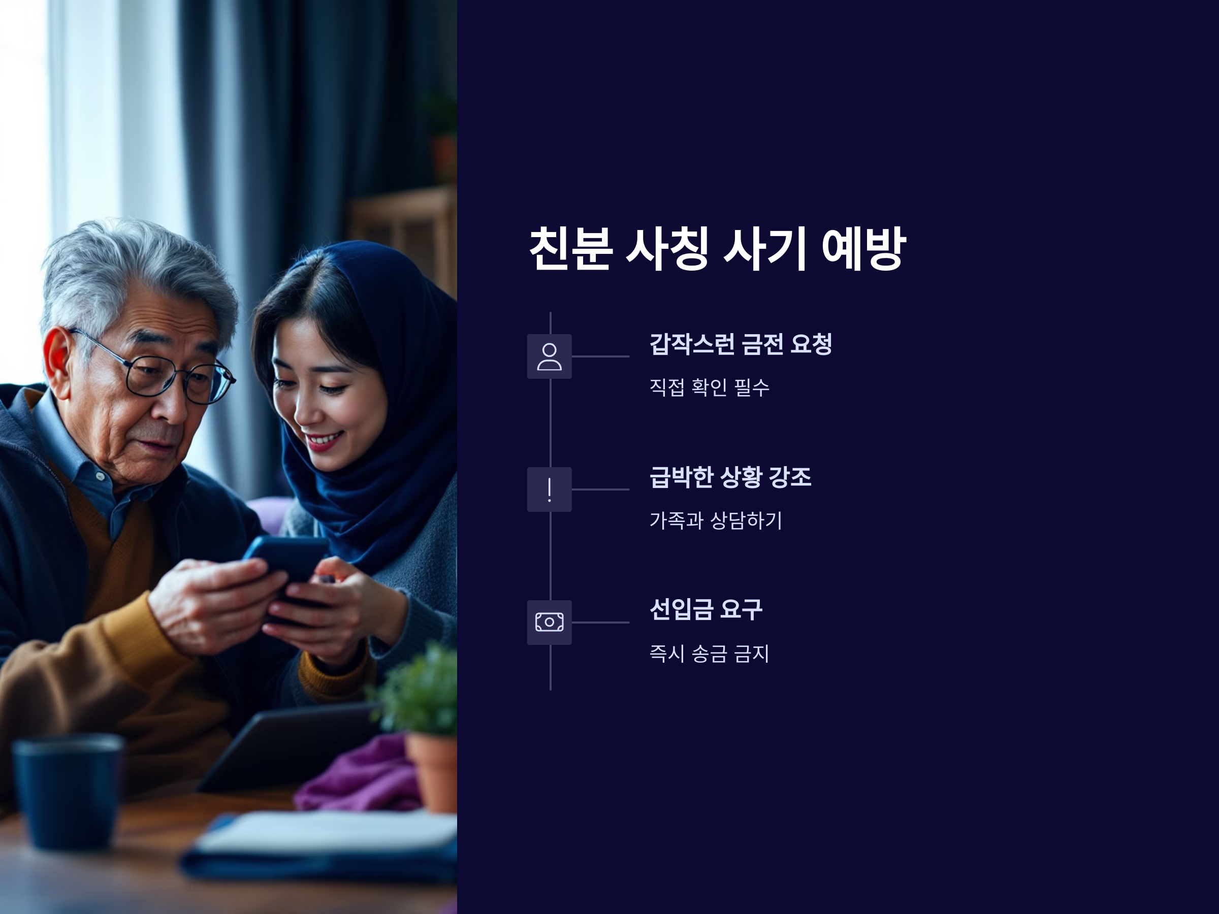 - 갑자기 친척이나 친구가 금전적 지원을 요청할 때는 반드시 직접 확인합니다.