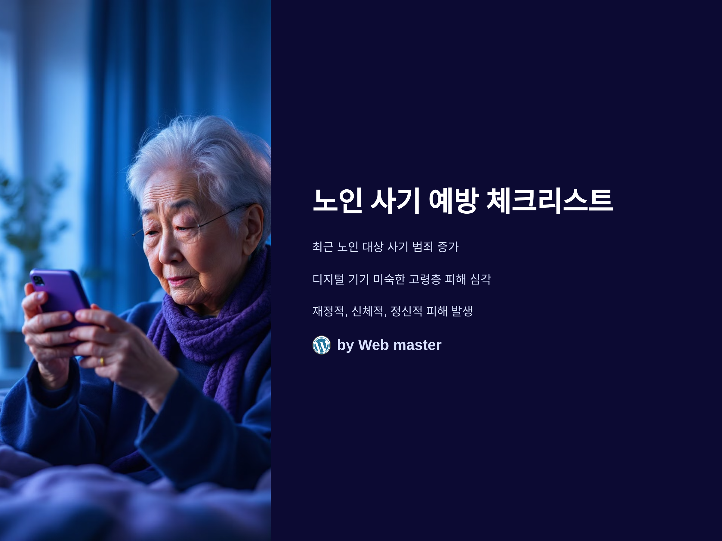 최근 들어 노인을 대상으로 한 사기 범죄가 점차 증가하고 있으며, 그 수법도 날로 교묘해지고 있습니다. 특히 디지털 기기나 인터넷 사용에 익숙하지 않은 고령층을 대상으로 한 범죄가 빈번히 발생하고 있습니다. 이로 인해 많은 노인들이 재정적 피해를 입고 있으며, 심각한 경우 신체적, 정신적 피해까지 겪고 있습니다. 따라서 노인들이 사기 범죄를 예방할 수 있도록 주의 깊게 점검할 수 있는 체크리스트를 제공합니다.