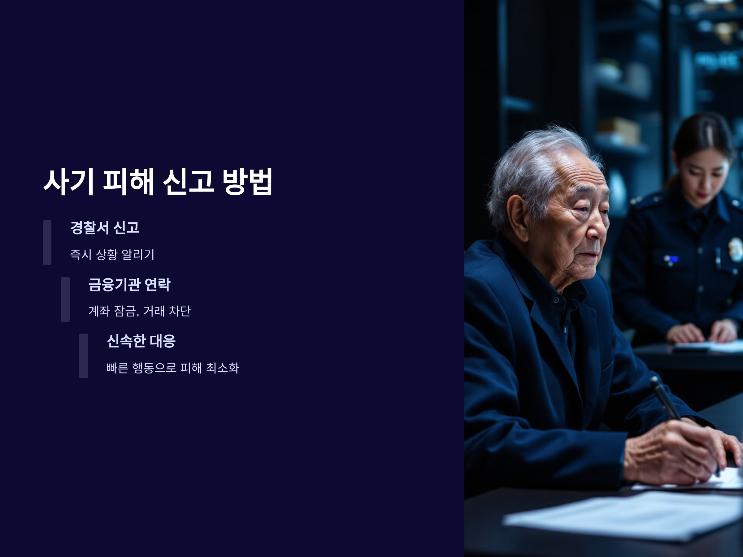 사기 피해를 당했다면 바로 신고하여 피해를 최소화하는 것이 중요합니다. 피해 사실을 숨기지 말고, 주변 사람들과 신속하게 상황을 공유해야 합니다.