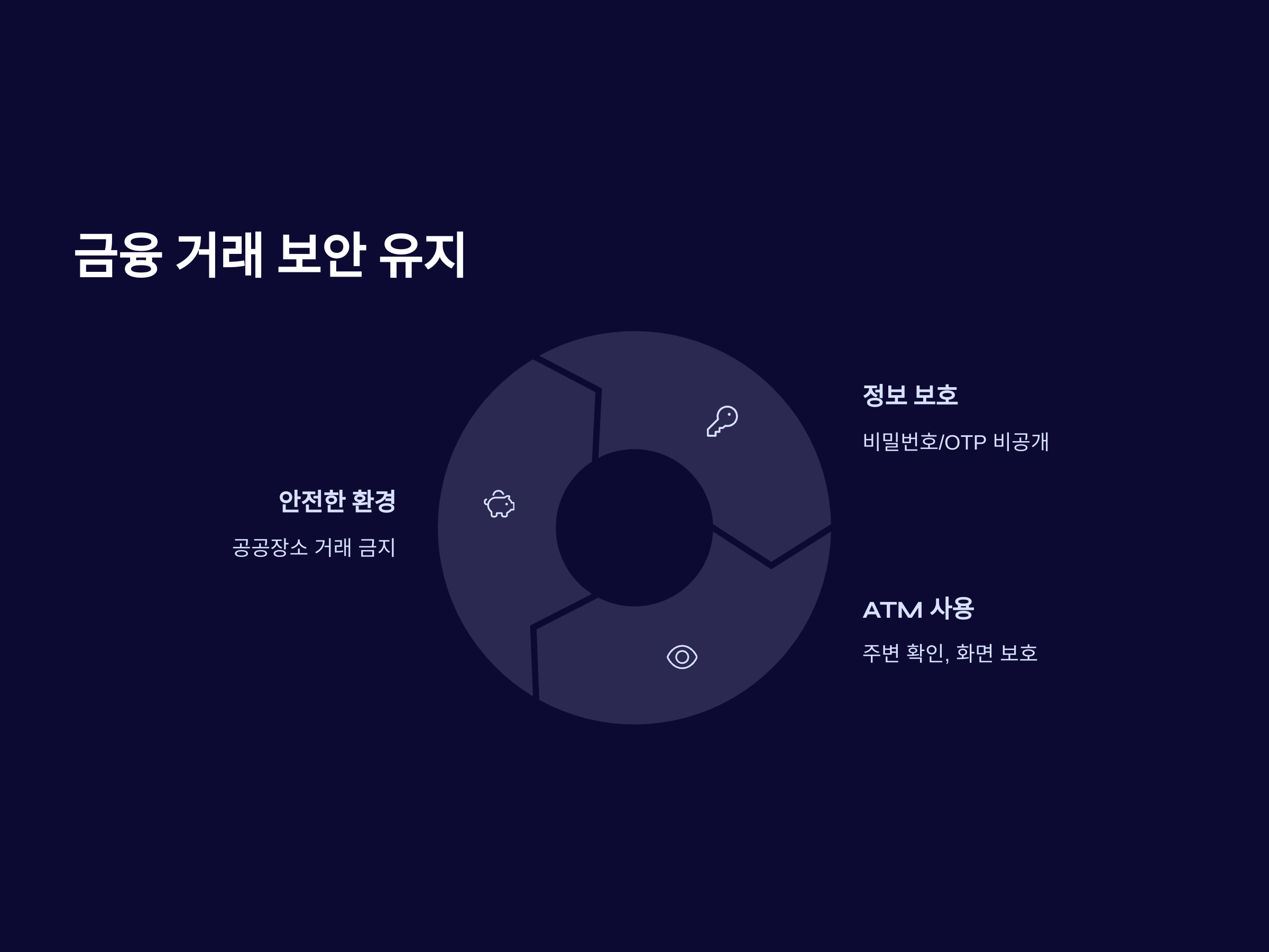 - ATM을 사용할 때는 항상 주변을 확인하고, 타인이 자신의 화면을 엿볼 수 없도록 주의합니다.