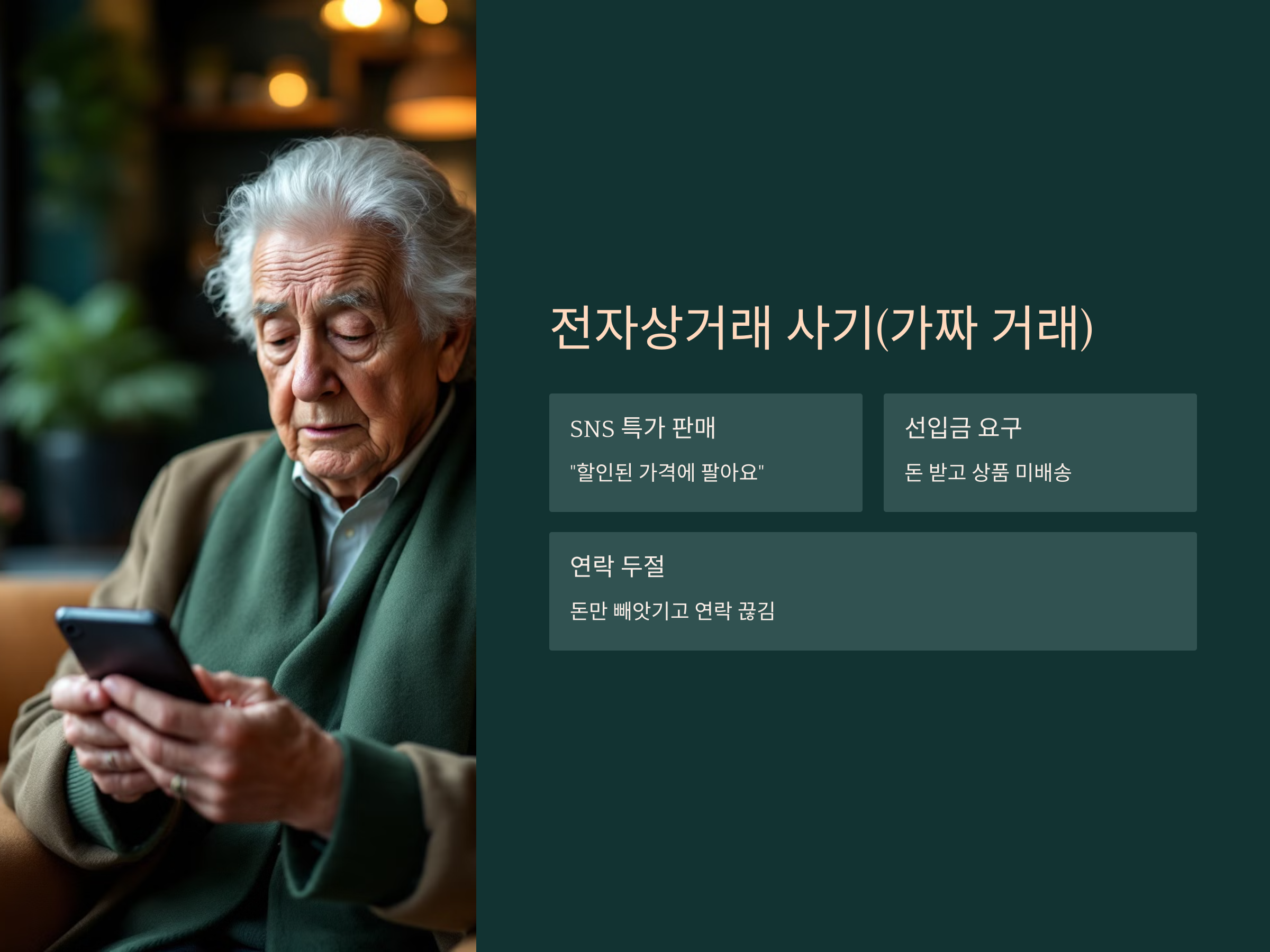 전자상거래가 활성화되면서, 이를 악용한 가짜 거래가 늘고 있습니다. 노인들은 가짜 상품을 팔며 돈을 챙기는 사기에 쉽게 당할 수 있습니다. 예를 들어, SNS나 온라인 커뮤니티에서 "할인된 가격에 팔아요", "특가 판매 중" 등의 메시지로 유혹한 뒤 상품을 사려고 돈을 보내면, 결국 아무것도 받지 못하는 사기입니다. 이때 범죄자는 물건을 배송하지 않고 연락도 끊어버립니다.
