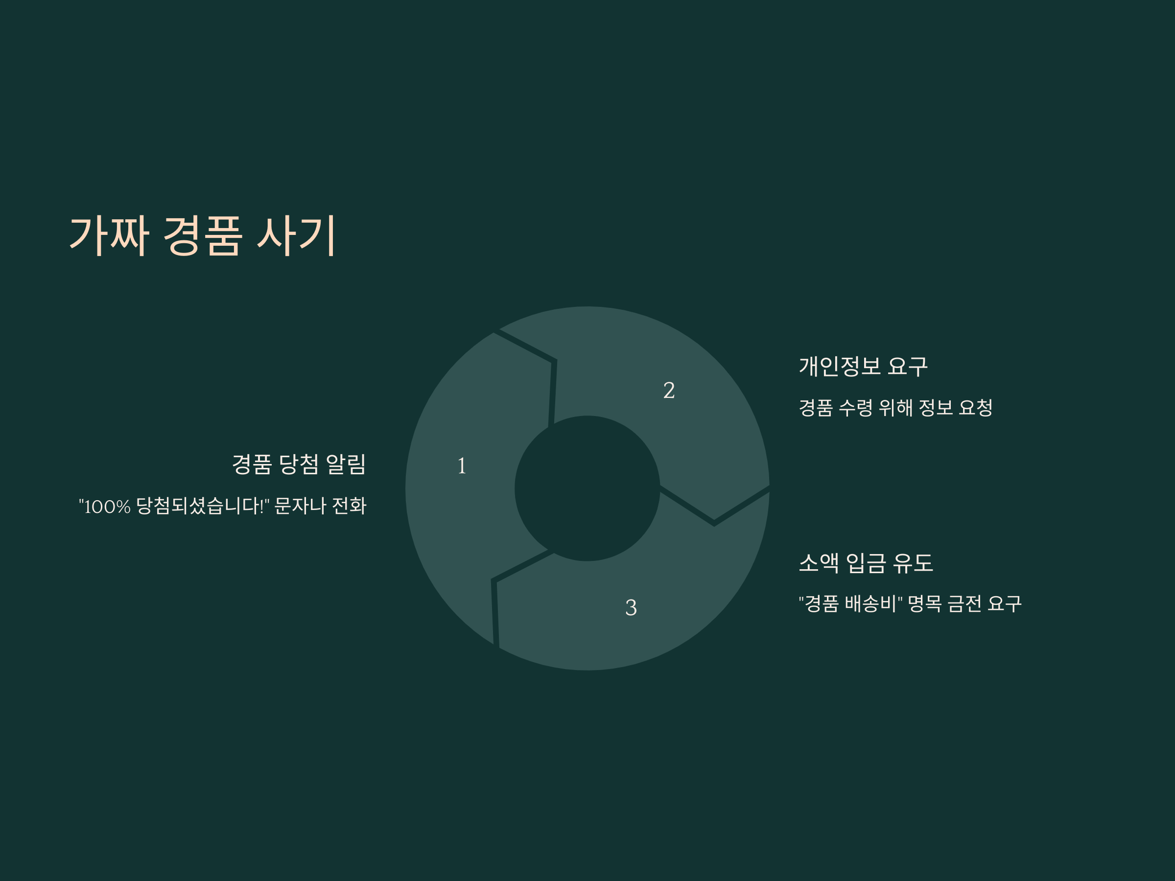 "100% 당첨되셨습니다!"라는 문자나 전화, 이메일을 받았을 때, 이를 가짜 경품 사기로 인식해야 합니다. 범죄자는 경품을 제공한다는 미끼로 노인들에게 연락을 취해 개인정보를 요구하거나, 경품을 받기 위해 '소액을 먼저 입금하라'는 방식으로 돈을 갈취합니다.