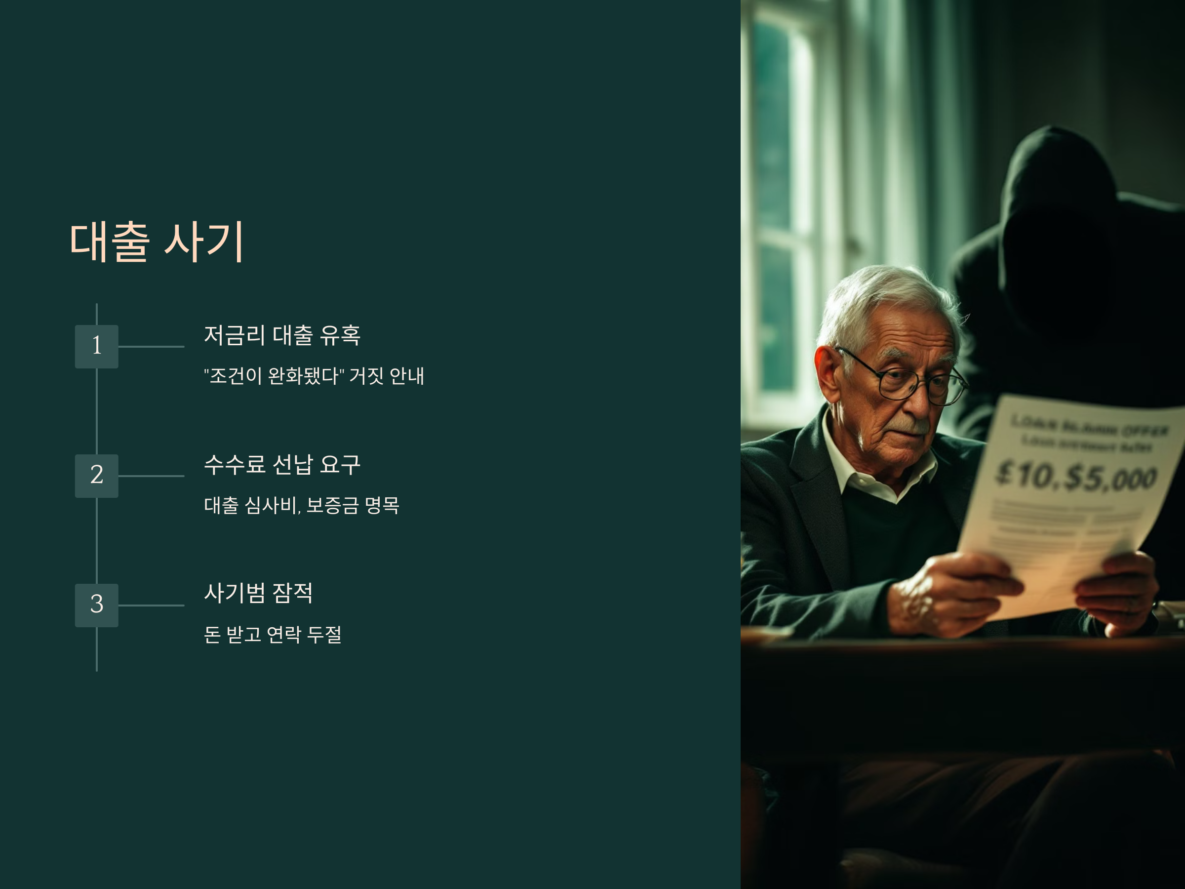 대출 사기도 노인들이 자주 당하는 사기 수법입니다. "저금리 대출을 받을 수 있다", "조건이 완화됐다"는 말로 유혹하면서 대출을 해주겠다고 약속하는 범죄자들이 많습니다. 이들은 대출을 제공해주는 것처럼 속이고 수수료나 보증금을 먼저 요구하는데, 결국 돈을 받고 사라집니다.