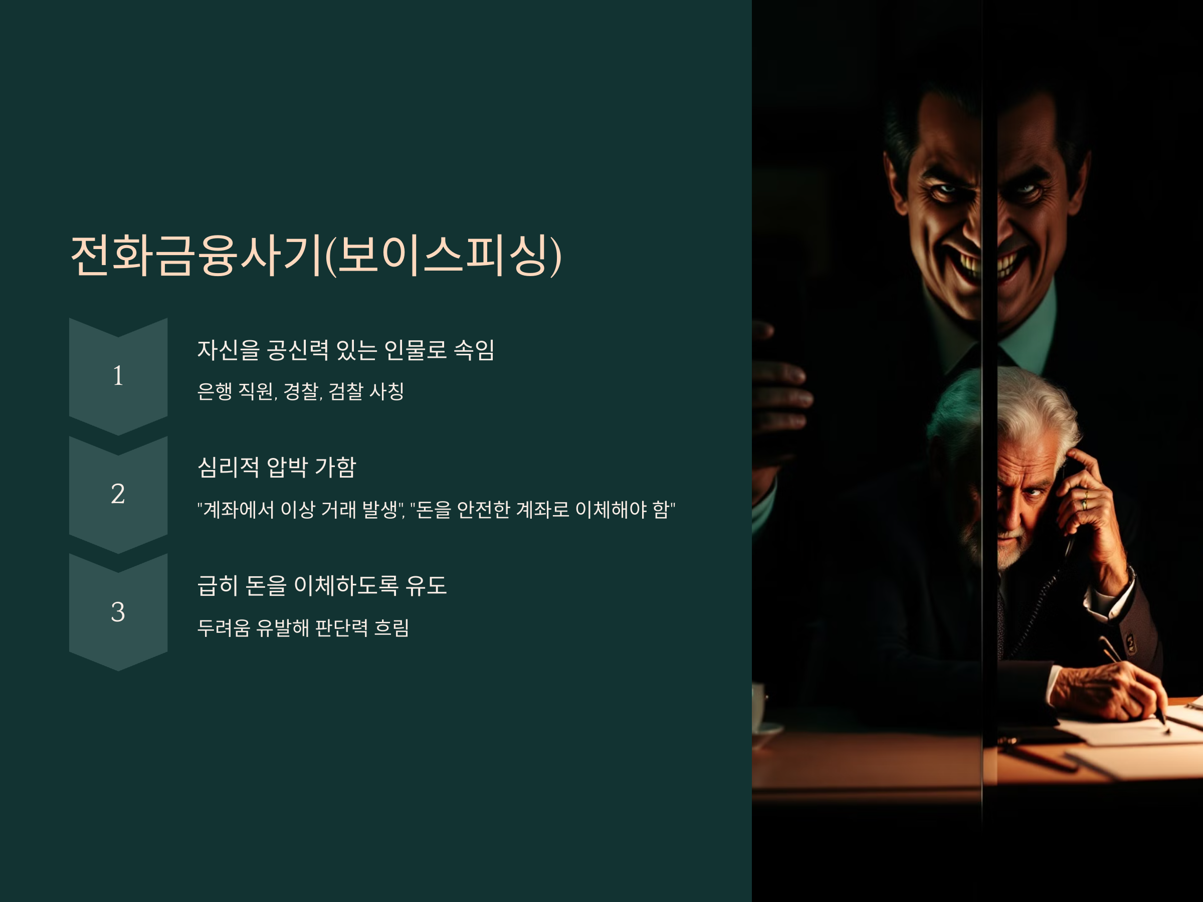 전화금융사기, 즉 보이스피싱은 노인들이 가장 많이 당하는 사기 중 하나입니다. 이 사기 수법은 범죄자가 전화로 자신을 은행 직원, 경찰, 검찰 등 공신력 있는 인물로 속여 금전적 이익을 가로채는 방식입니다. "고객님의 계좌에서 이상 거래가 발생했습니다", "지금 당장 돈을 안전한 계좌로 이체하지 않으면 큰일 납니다" 등의 문구를 사용해 노인을 심리적으로 압박하고 급히 돈을 이체하도록 유도합니다.