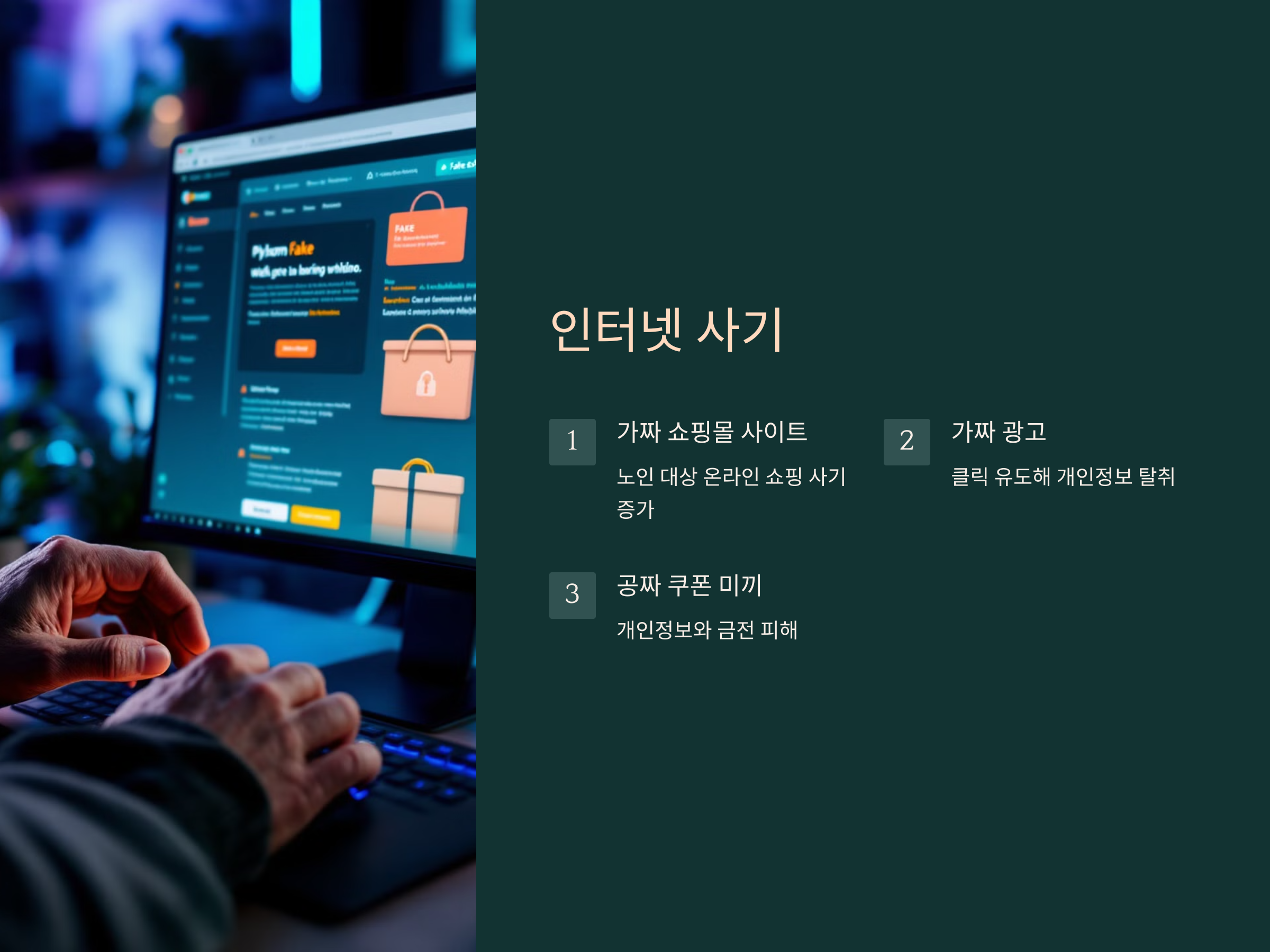인터넷을 통한 사기도 증가하고 있습니다. 최근에는 노인들을 대상으로 한 온라인 쇼핑 사기, 가짜 웹사이트를 통한 개인정보 유출 사건 등이 늘고 있습니다. 범죄자는 가짜 쇼핑몰 사이트나 가짜 광고를 통해 물건을 사기 위한 유인책을 제공합니다. 노인들은 이러한 사이트에서 상품을 구입하려고 하거나, 공짜 쿠폰을 받을 수 있다는 유혹에 빠져 개인정보와 돈을 빼앗기게 됩니다.