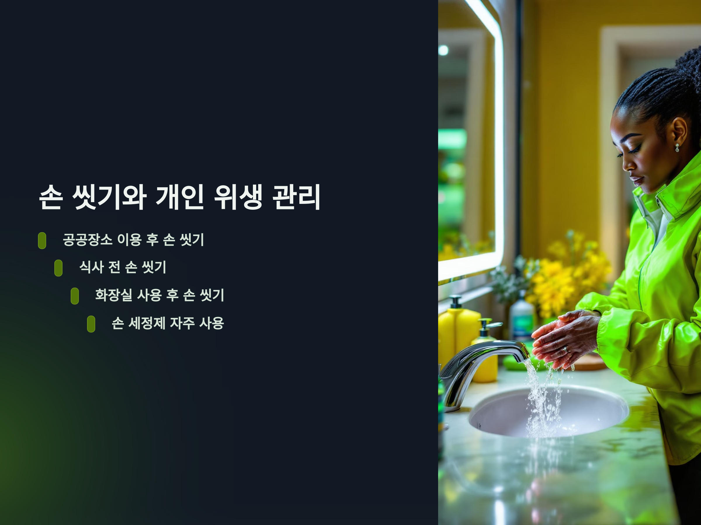감기 예방에서 중요한 부분 중 하나는 개인 위생 관리입니다. 노인은 면역력이 약하므로 감염의 위험을 줄이기 위해 더욱 철저히 손 씻기와 개인 위생을 관리해야 합니다. 공공장소를 이용한 후, 식사 전, 화장실 사용 후에는 반드시 손을 깨끗하게 씻는 습관을 들여야 합니다.
