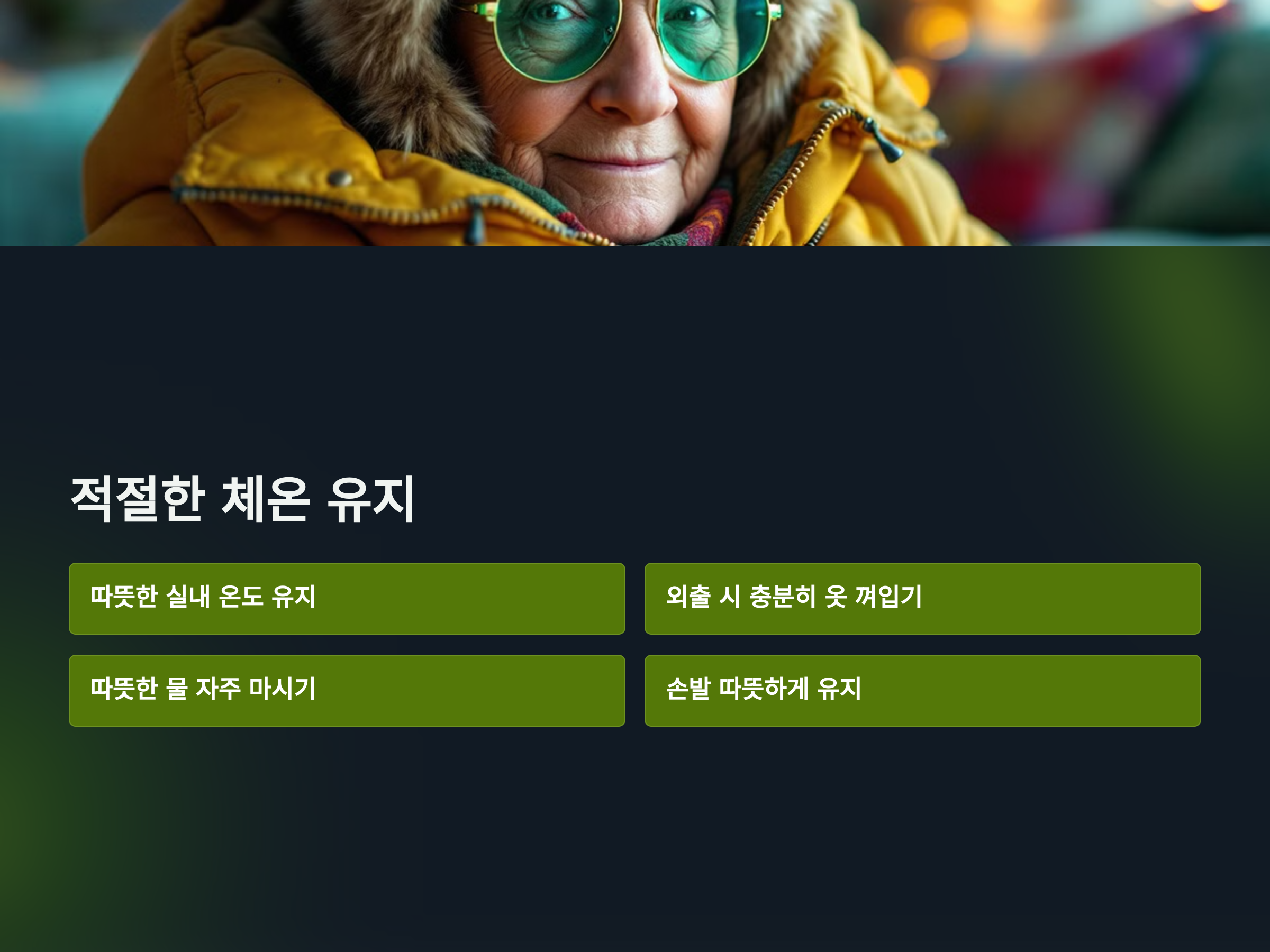 따뜻한 물을 자주 마시거나, 손발이 차가워지지 않도록 관리하며, 외출 후에는 바로 따뜻한 음료나 식사를 통해 체온을 빠르게 회복할 수 있도록 해야 합니다.