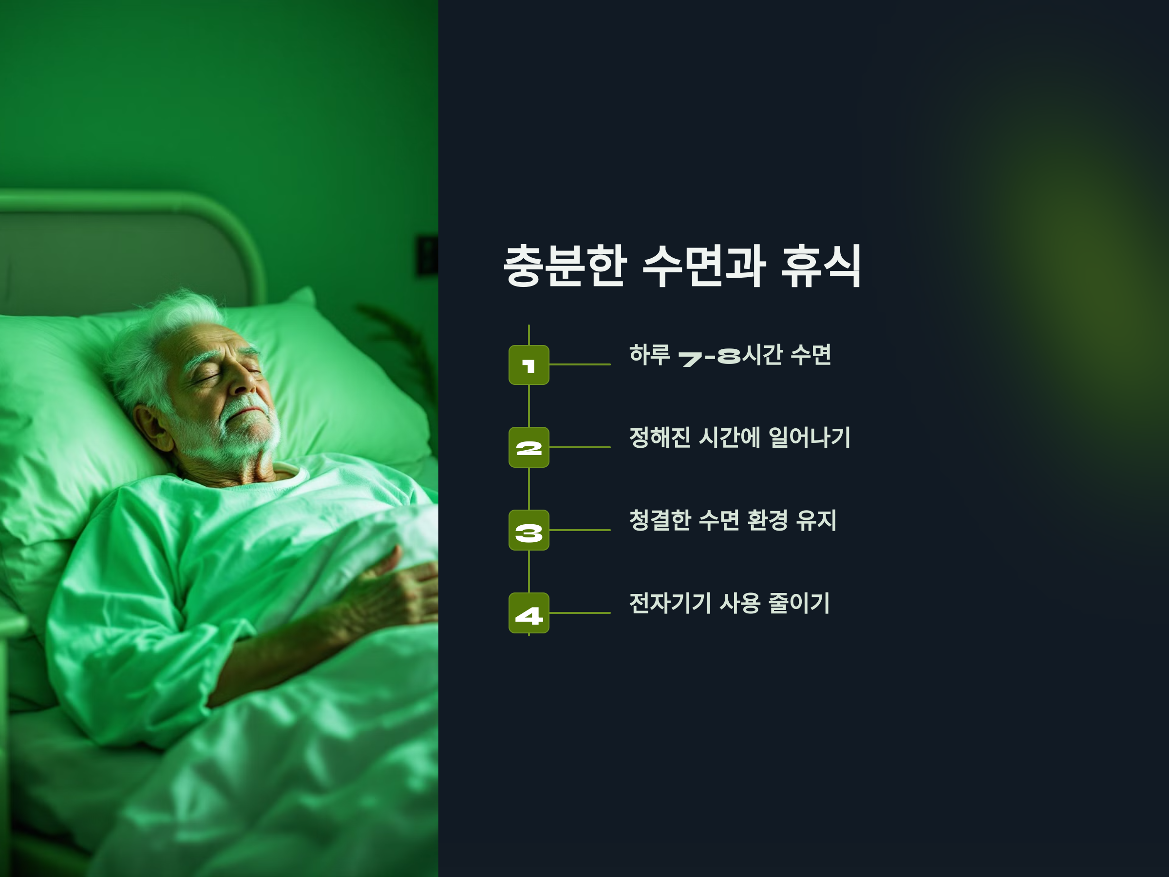 노인의 면역력 강화를 위한 중요한 요소 중 하나는 충분한 수면입니다. 나이가 들수록 수면의 질이 떨어지기 쉬운데, 충분한 수면을 취하는 것은 면역력을 높이는 데 매우 중요한 역할을 합니다. 수면 중에 신체는 회복되고 면역 세포가 생성되기 때문입니다.