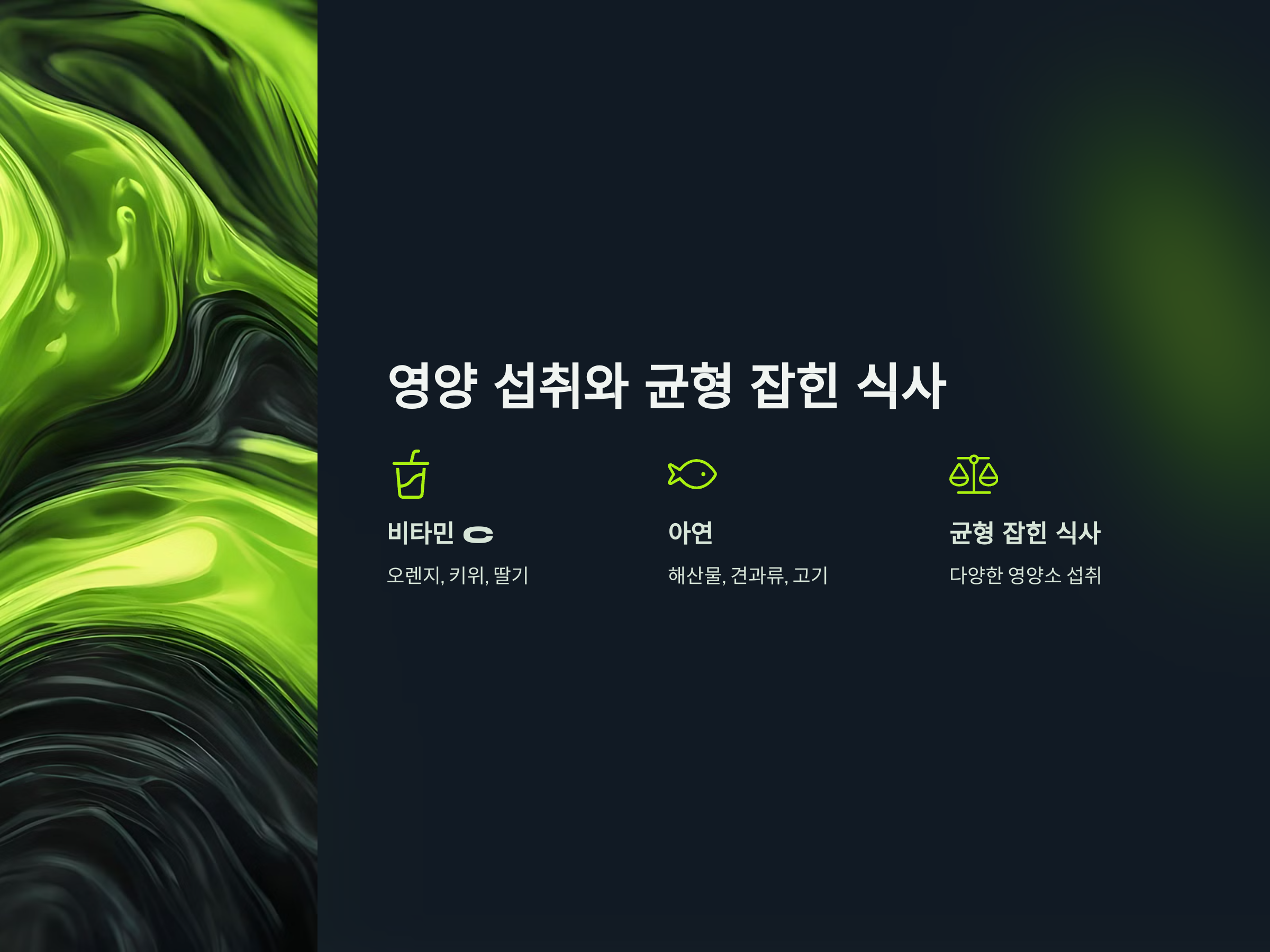 비타민 C는 면역력을 높이는 대표적인 영양소로, 감기 예방에 효과적입니다. 과일 중에서는 오렌지, 키위, 딸기 등이 비타민 C가 풍부합니다. 또한, 아연이 많은 음식인 해산물, 견과류, 고기 등도 면역력 강화에 도움이 됩니다. 균형 잡힌 식사를 통해 노인은 몸의 면역 시스템을 강화할 수 있습니다.