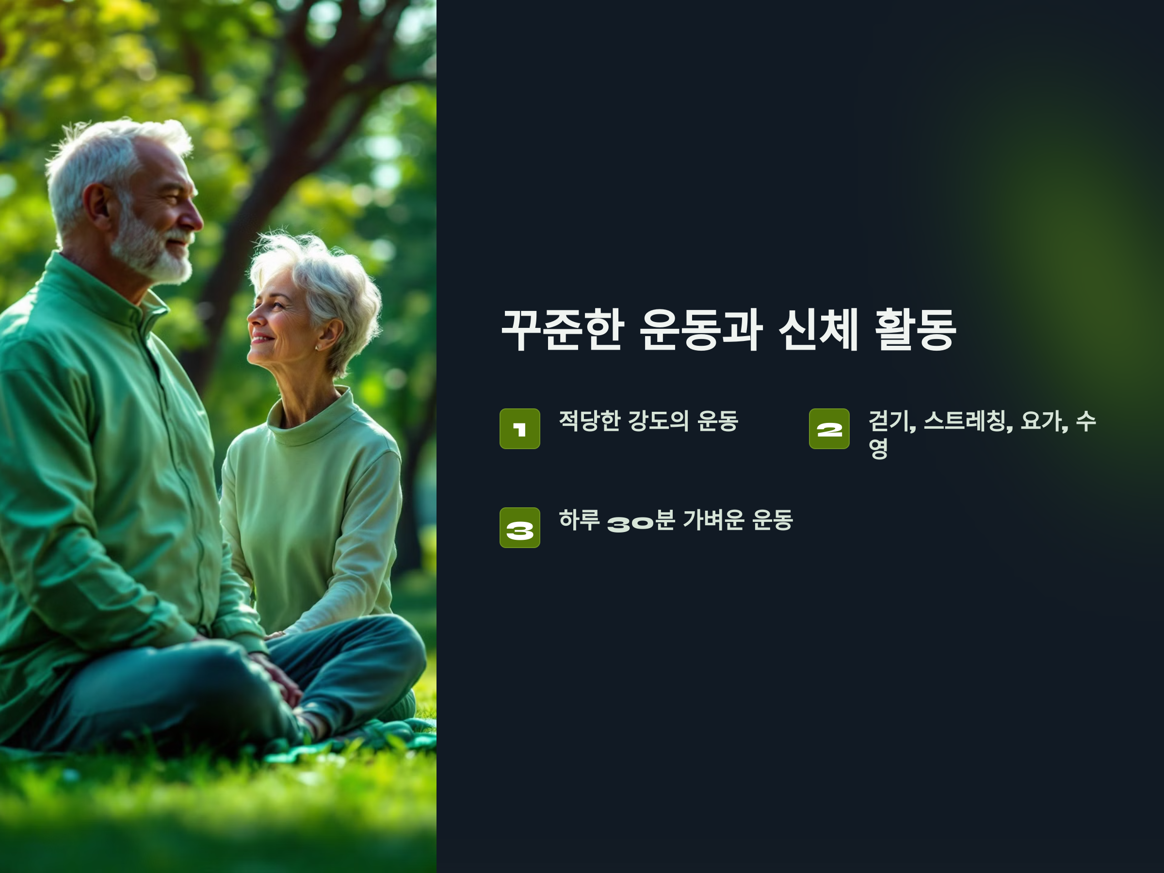 하루에 30분 정도의 가벼운 운동을 꾸준히 실천하면 혈액순환이 원활해지고, 면역 세포들이 더욱 활발히 활동하게 됩니다. 특히 걷기와 같은 유산소 운동은 심혈관 건강에도 도움을 줍니다. 노인의 경우 운동 후 무리하지 않도록 하며, 점차적으로 운동량을 늘려가도록 하는 것이 좋습니다.