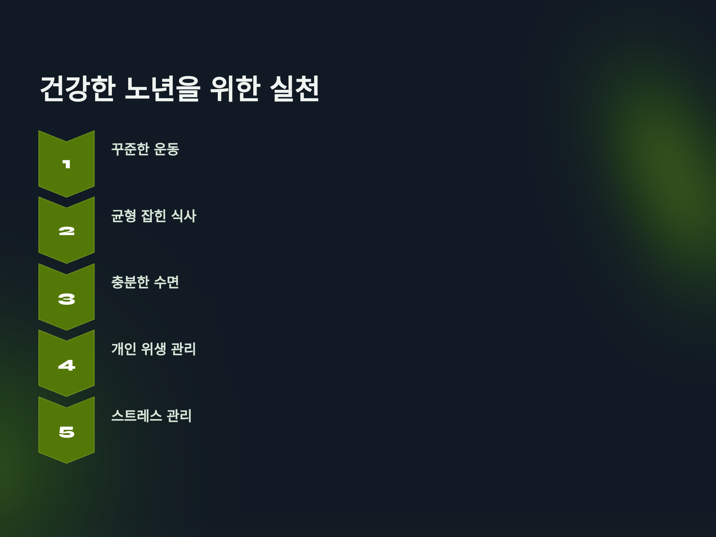 노인의 건강을 지키기 위한 작은 실천들이 결국 큰 변화를 만들 수 있습니다. 지금부터라도 차근차근 실천해보세요.