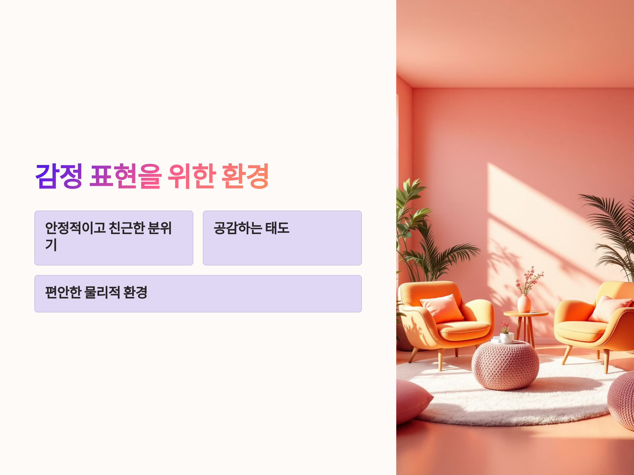 이 과정에서 중요한 것은 감정을 억누르지 않고 솔직하게 표현하는 것입니다. 감정을 나누는 것이 어렵다면, 일기나 감정 표현을 위한 간단한 활동을 시도할 수도 있습니다. 자신만의 감정 기록을 남기면서 감정을 인식하고 표현하는 연습을 하는 것도 매우 유익한 방법입니다.