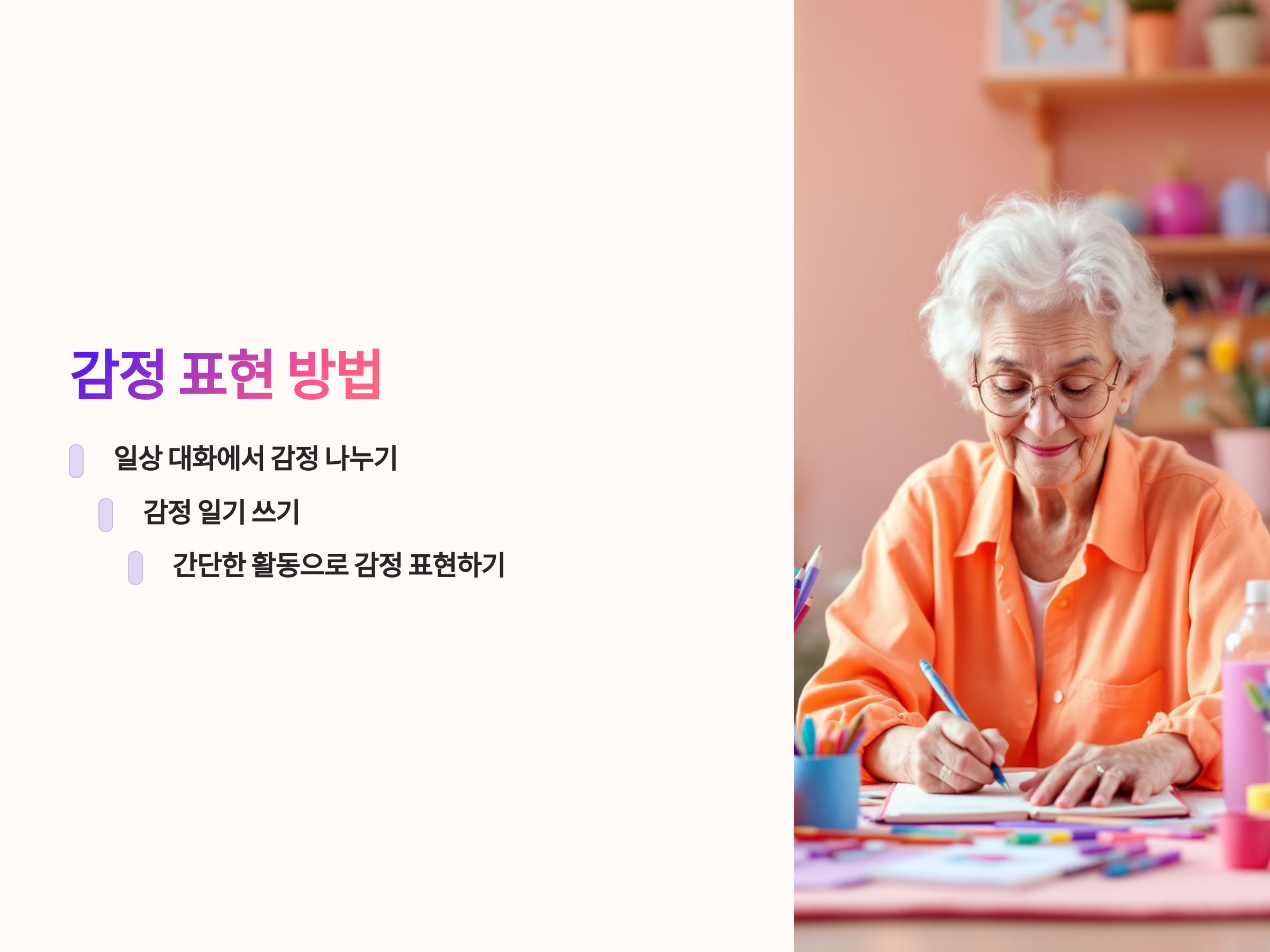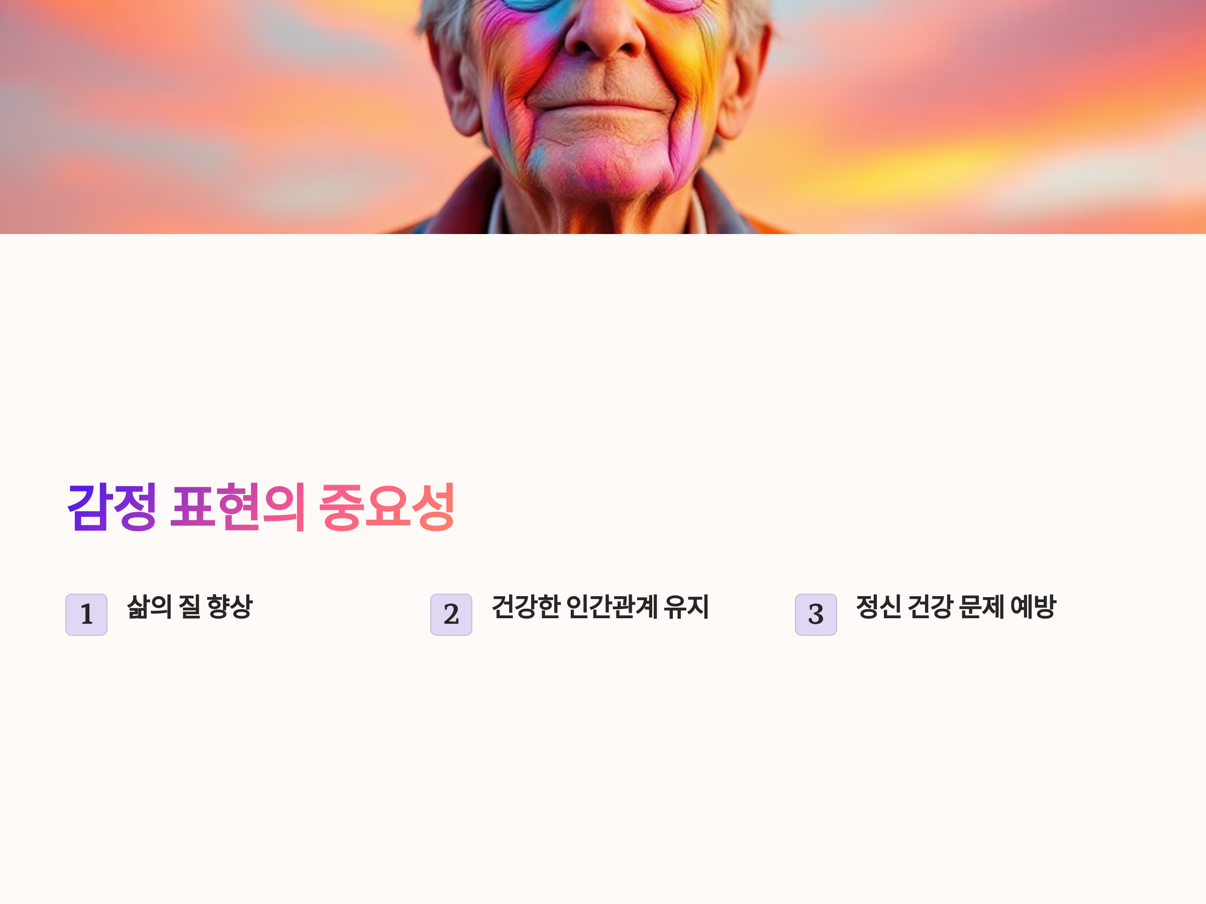 따라서 감정 표현은 단지 마음의 안정을 넘어 신체 건강에도 직결된 중요한 문제입니다. 노인이 감정을 표현하는 것이 단순한 ‘소통’을 넘어서 그들의 전반적인 건강을 증진시킬 수 있는 강력한 도구임을 인식하는 것이 중요합니다.