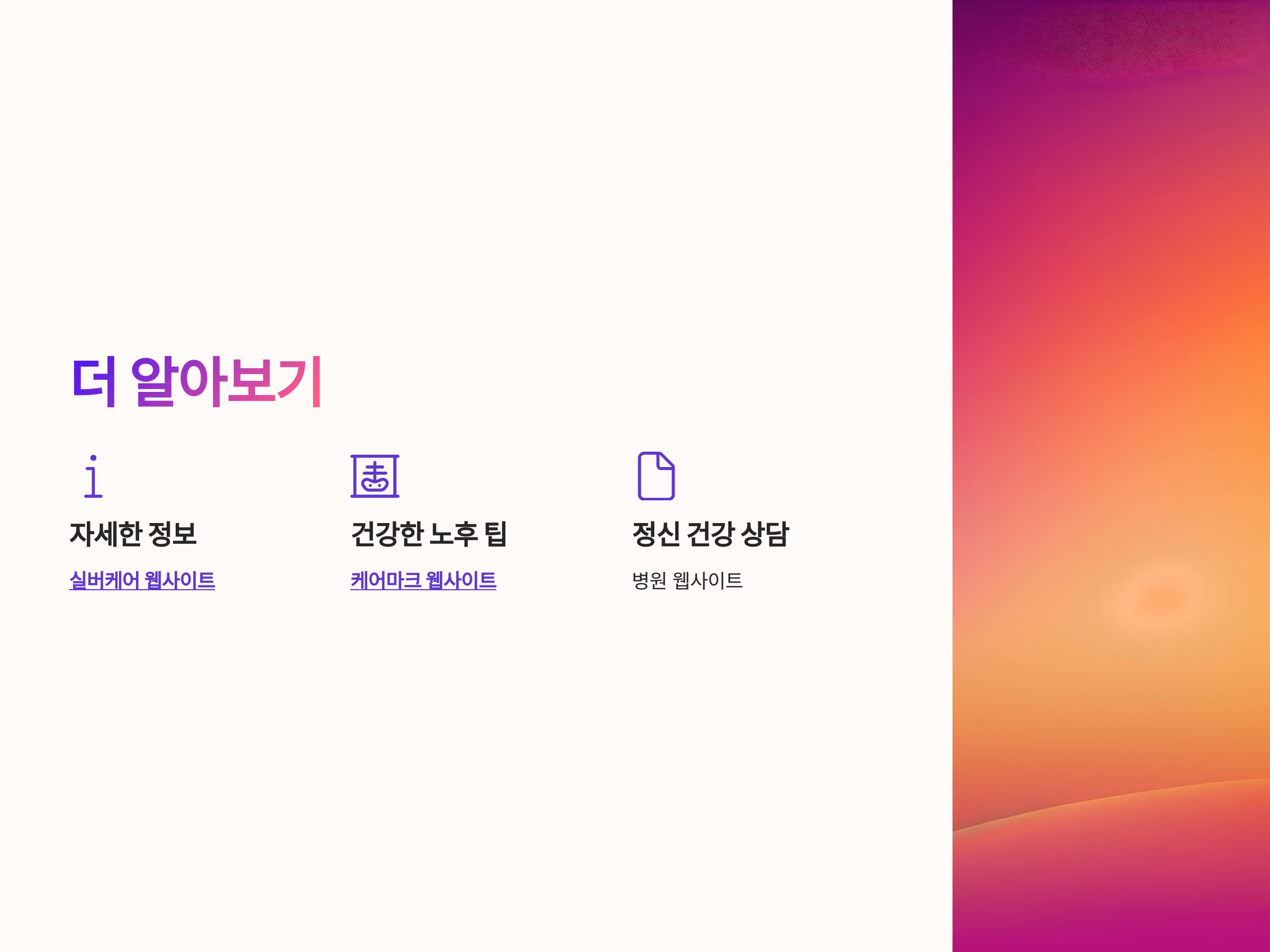 더 자세한 정보를 원하시면 여기를 클릭하세요건강한 노후를 위한 꿀팁 보기정신 건강을 위한 상담 서비스