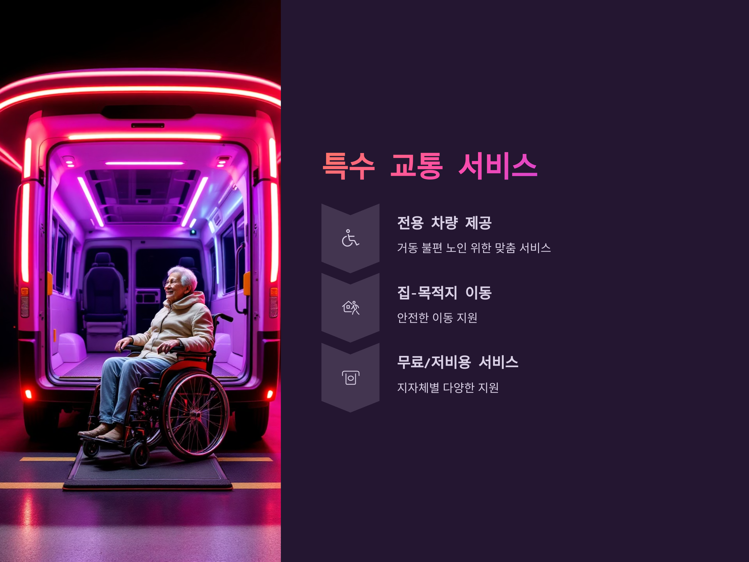 대중교통 이용이 어려운 노인을 위해 특수 교통 서비스가 제공되기도 합니다. 이 서비스는 휠체어를 사용하는 노인이나 거동이 불편한 사람들을 위해 마련된 교통 서비스로, 전용 차량을 제공하여 집에서 목적지까지 안전하게 이동할 수 있도록 돕습니다. 일부 지자체에서는 이러한 특수 교통 서비스를 무료로 제공하거나 저렴한 비용으로 이용할 수 있게 지원하고 있습니다.