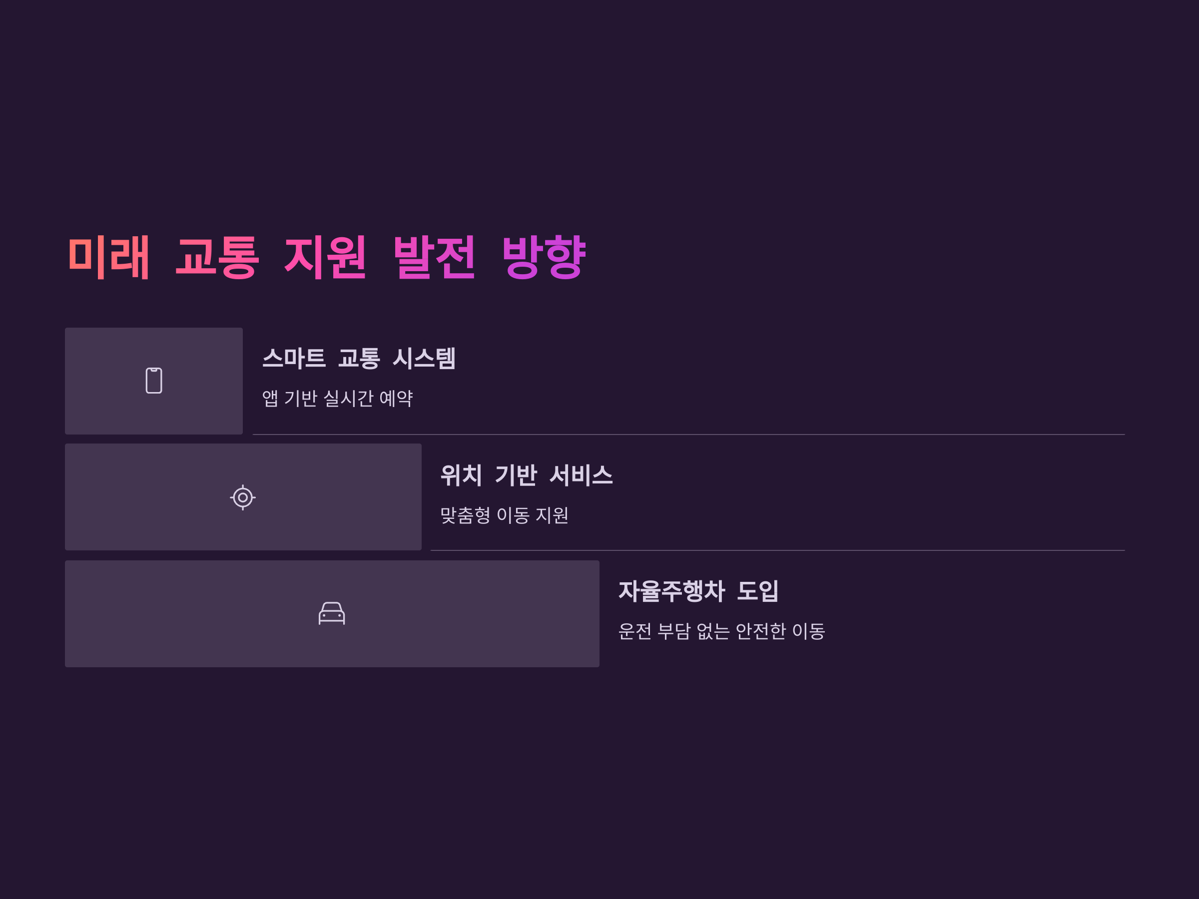 스마트폰 앱을 이용한 교통 예약 시스템, 위치 기반 서비스 등을 통해 노인들이 교통수단을 실시간으로 확인하고 예약할 수 있는 시스템이 개발되고 있습니다. 이러한 시스템은 노인들이 복잡한 대중교통을 이용할 필요 없이, 원하는 시간과 장소에서 쉽게 이동할 수 있도록 돕습니다.
