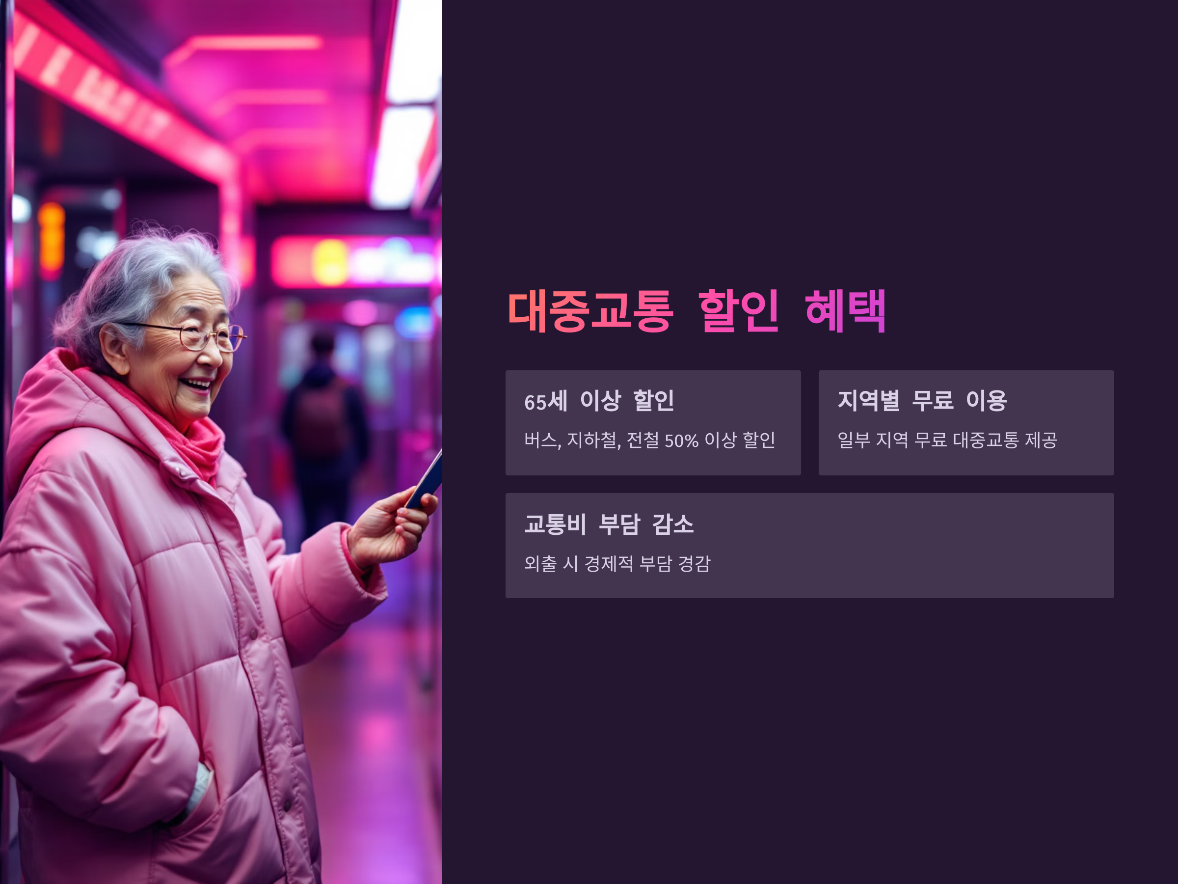 대부분의 지방자치단체에서는 65세 이상의 노인을 대상으로 버스, 지하철, 전철 등 대중교통 요금을 할인해주는 혜택을 제공하고 있습니다. 할인율은 지역에 따라 차이가 있지만, 대개 50% 이상의 할인을 받을 수 있습니다. 일부 지역에서는 대중교통을 무료로 이용할 수 있는 혜택도 제공되며, 이는 고령자들이 외출 시 교통비 부담을 줄여줍니다.